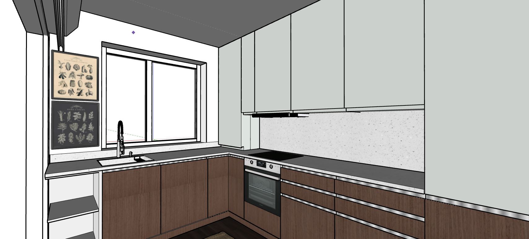photorealistic kitchen interior rendered from the sketchup model keeping all 3d elements exactly as in the model natural daylight entering through the window matte white mdf cabinets up to the ceiling walnut plank flooring with uniform tone matching walnut wood furniture starlet composite quartz countertop and backsplash with subtle speckles white cabinet with open shelves stainless steel faucet undermount sink in the same material