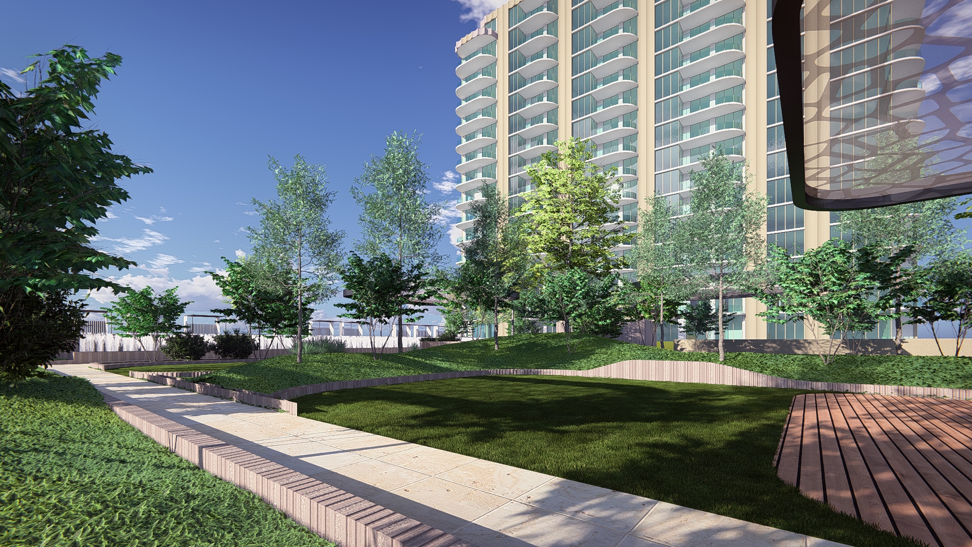 a manicured lawn layered flower beds low maintenance shrubs native plants rectangular stone pathway leading to the entrance loose furniture on the lawn with a few people spread about enhance the trees limit the planting to 4 colors with green being the most prominent