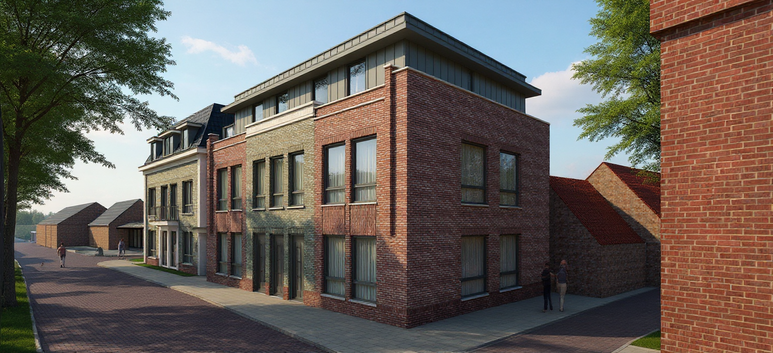 add some trees point sun on facade place curtains behind the windows add some realistic people on the sidewalk no windows in side facade