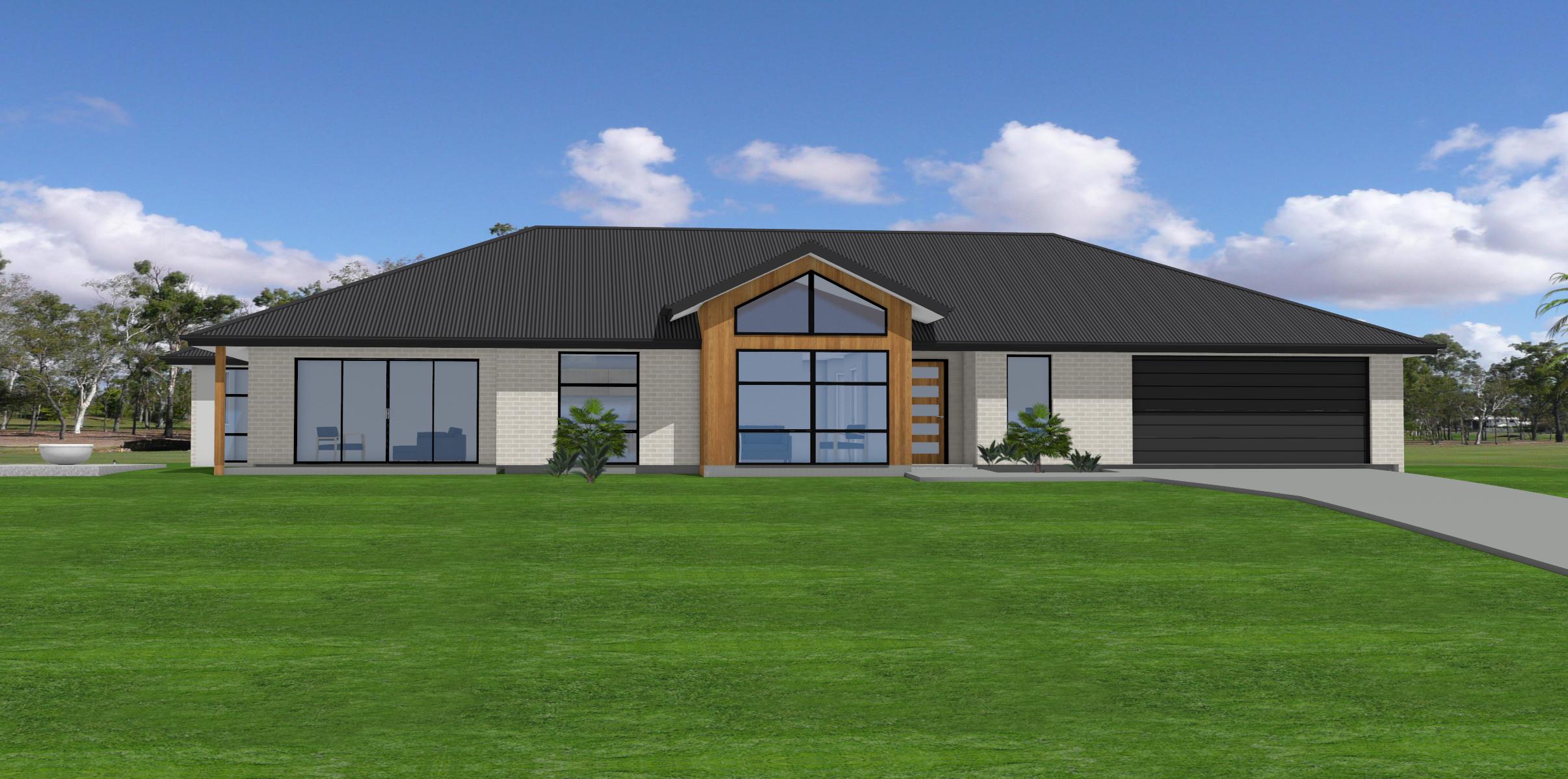 light brick and light timber walls dark steel roof flat lawn to front bright windows forest backdrop