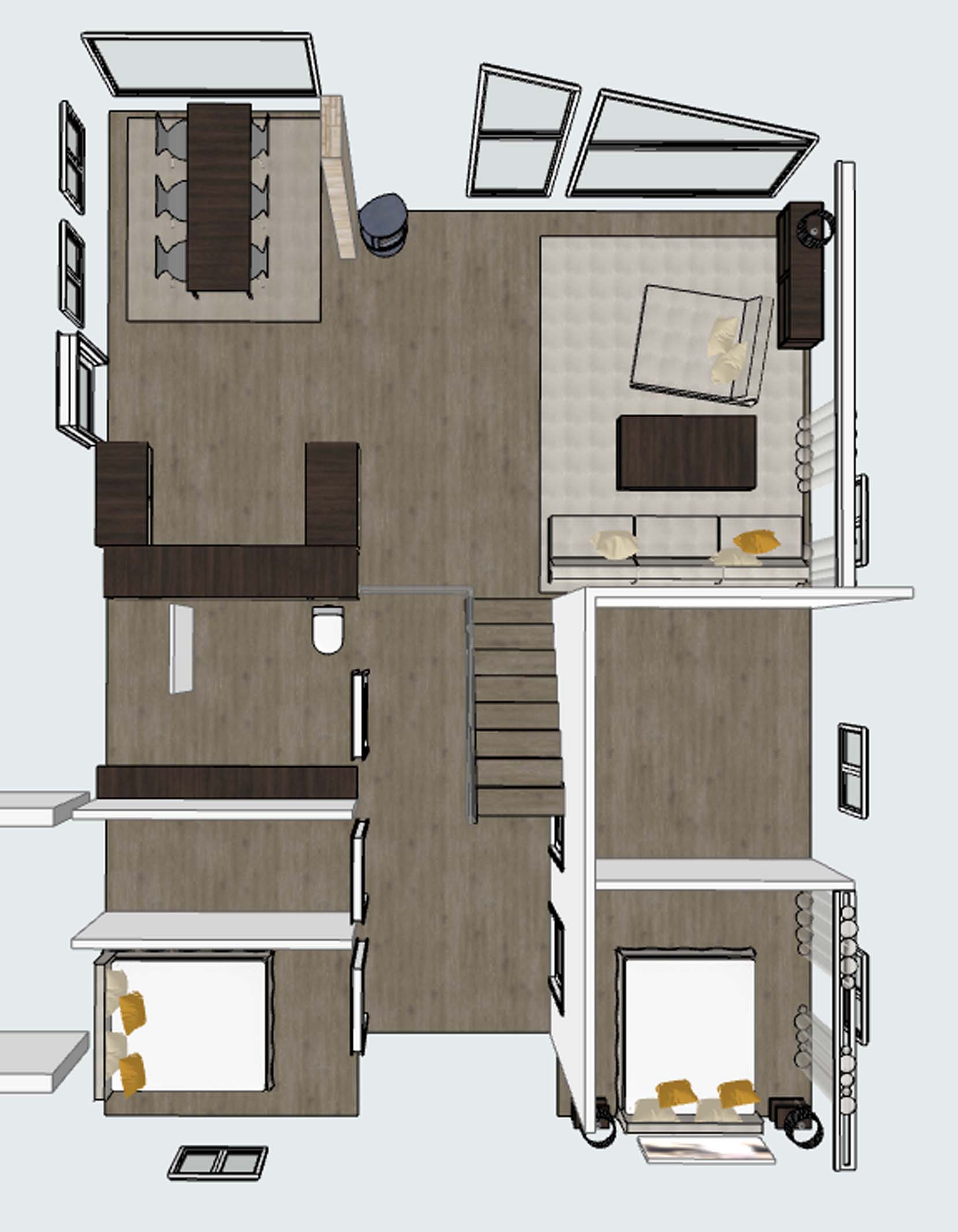 this is a iso plan from abow to down render it with modern furnitures a staircase to a second story is right before you enter the livingroom in the bathroom it s a shwer to te left for the toilet sink on the counter