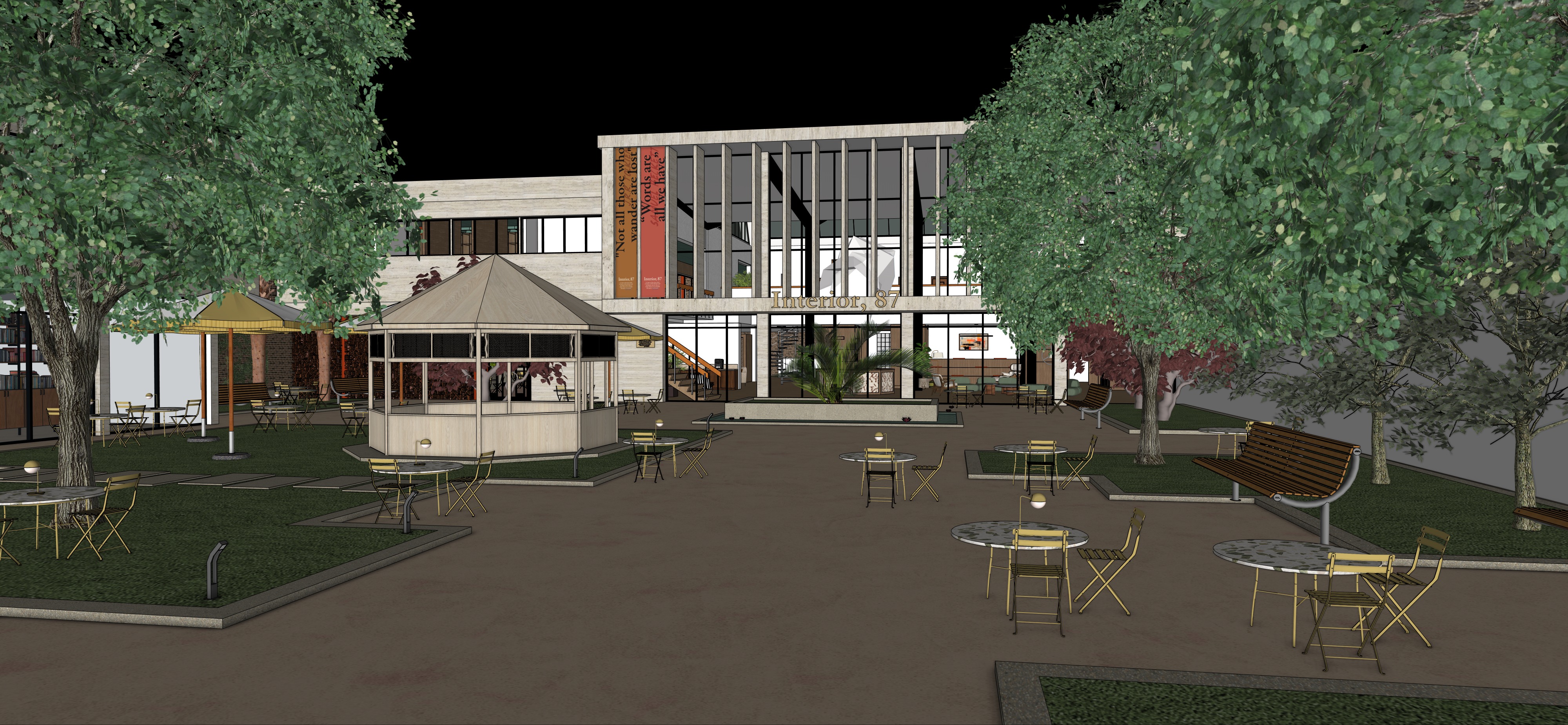 use the current render as the base image absolute preservation mode the architecture layout and composition must remain exactly the same do not change building geometry fa ade design columns windows trees umbrellas tables and chairs pavilion structure lighting fixtures people positions camera position lighting atmosphere everything must remain identical to the current scene only apply the following corrections ground material replace the ground surface with permeable saul pavement typical of barcelona parks natural compacted sand gravel texture warm beige tone fine granular texture with subtle irregularity do not convert it into concrete or plaza pavement building signage restore the original building typography exactly as in the sketchup model text must read interior 87 keep the same font style spacing and proportions used in the architectural design realism maintain the same evening lighting and atmosphere maintain the same people and activity do not redesign or reinterpret the architecture only correct the pavement and the typography