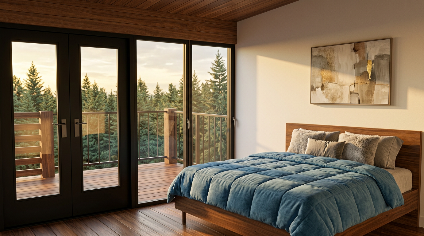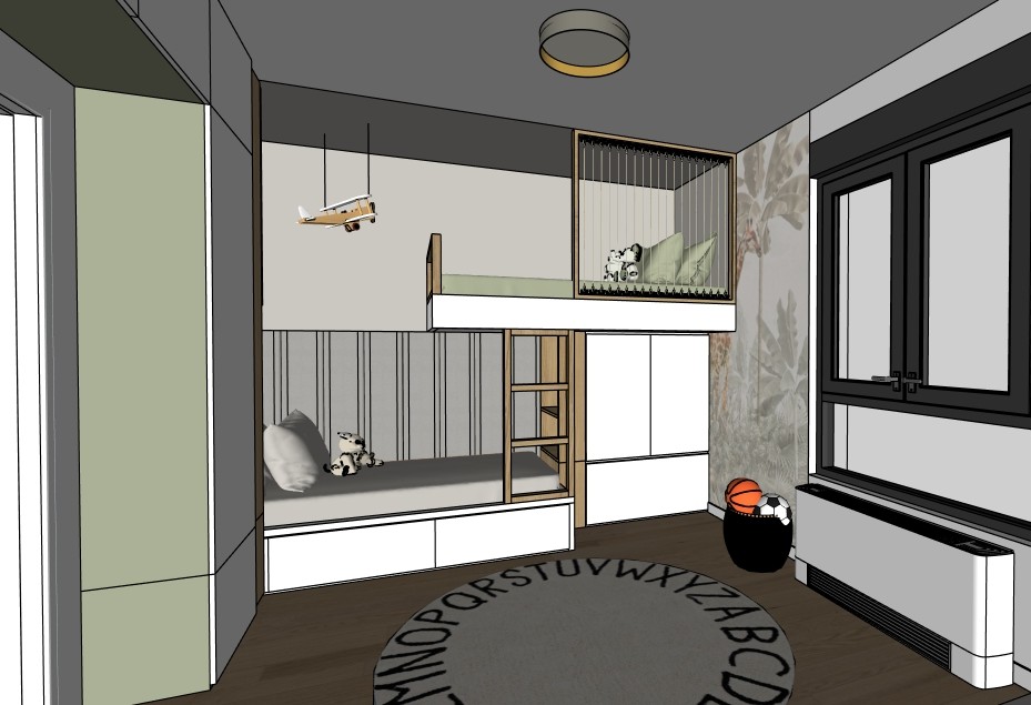 dodaj zavesu belu providnu samo da prekriva pola prozora i dodaj skriveno svetlo u zoni ispod kreveta na sprat donji krevet na zidu ima tapacirane obloge a gornji ima ogradu od debljih kanapa u drvenom ramu