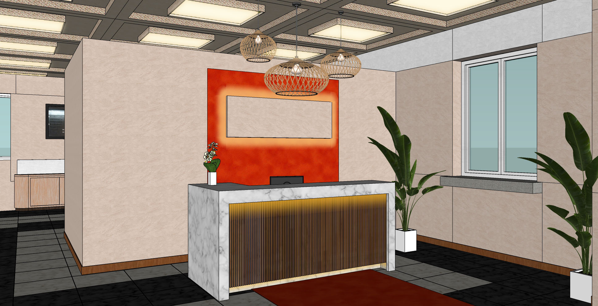 keep all design unchanged make the overall scene brighter with increased natural daylight filling the space slightly brighten the interior ceiling lighting increase general ambient light across the space but keep reception desk lighting as is ensure a warm evenly lit high end atmosphere with soft natural light and sunlight coming from the right side