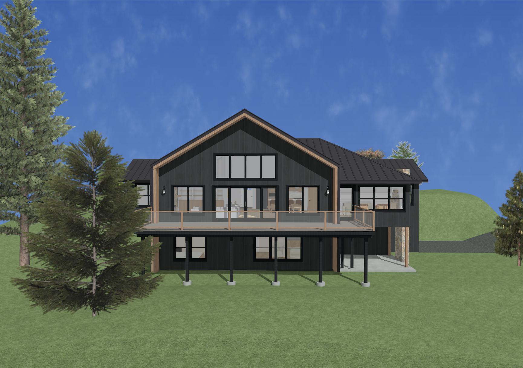 grainy watercolor render and stone wainscot watercolor trees environment in the background extensive watercolor landscaping surrounding the building with line call outs sketch