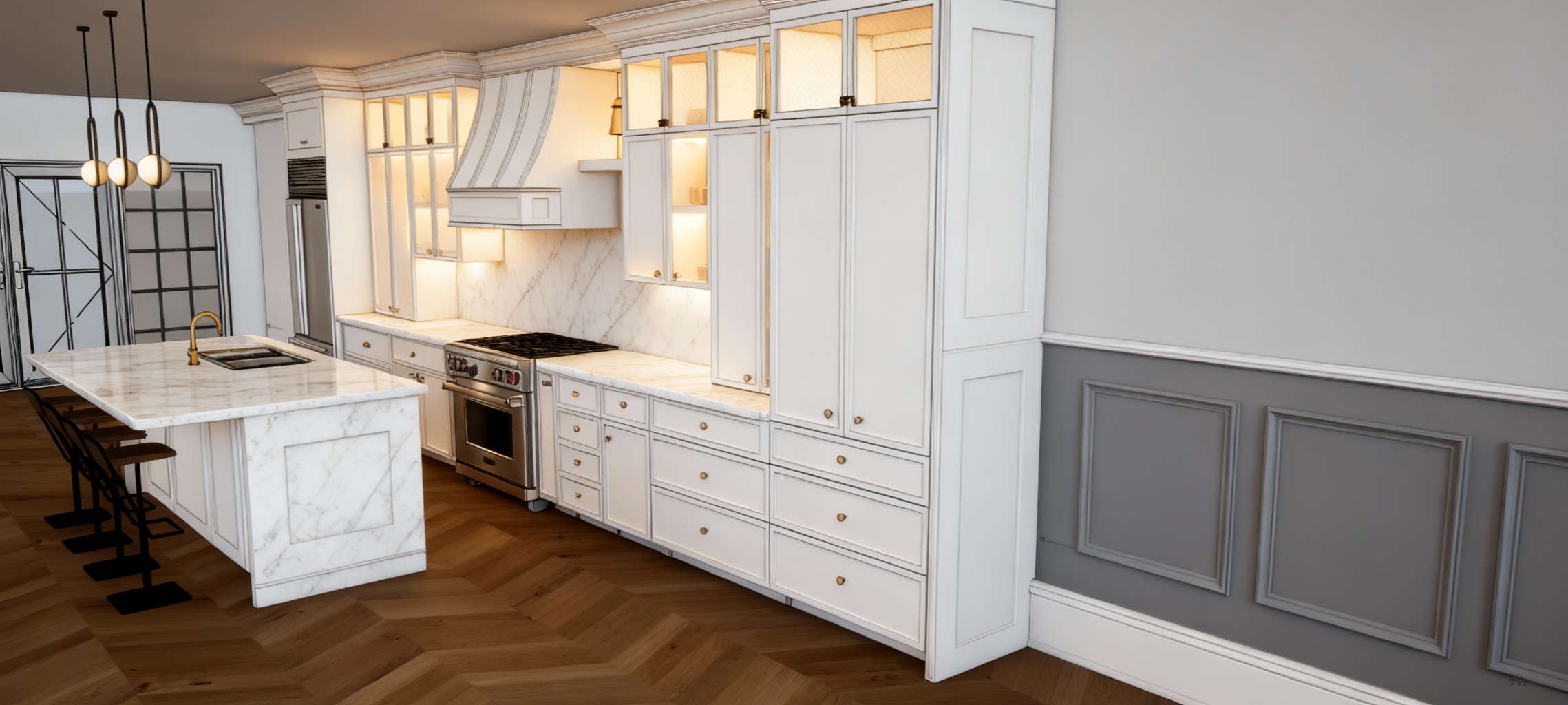 render it in white cabinet color add warm lighting inside glass cabinet flooring is light oak texure