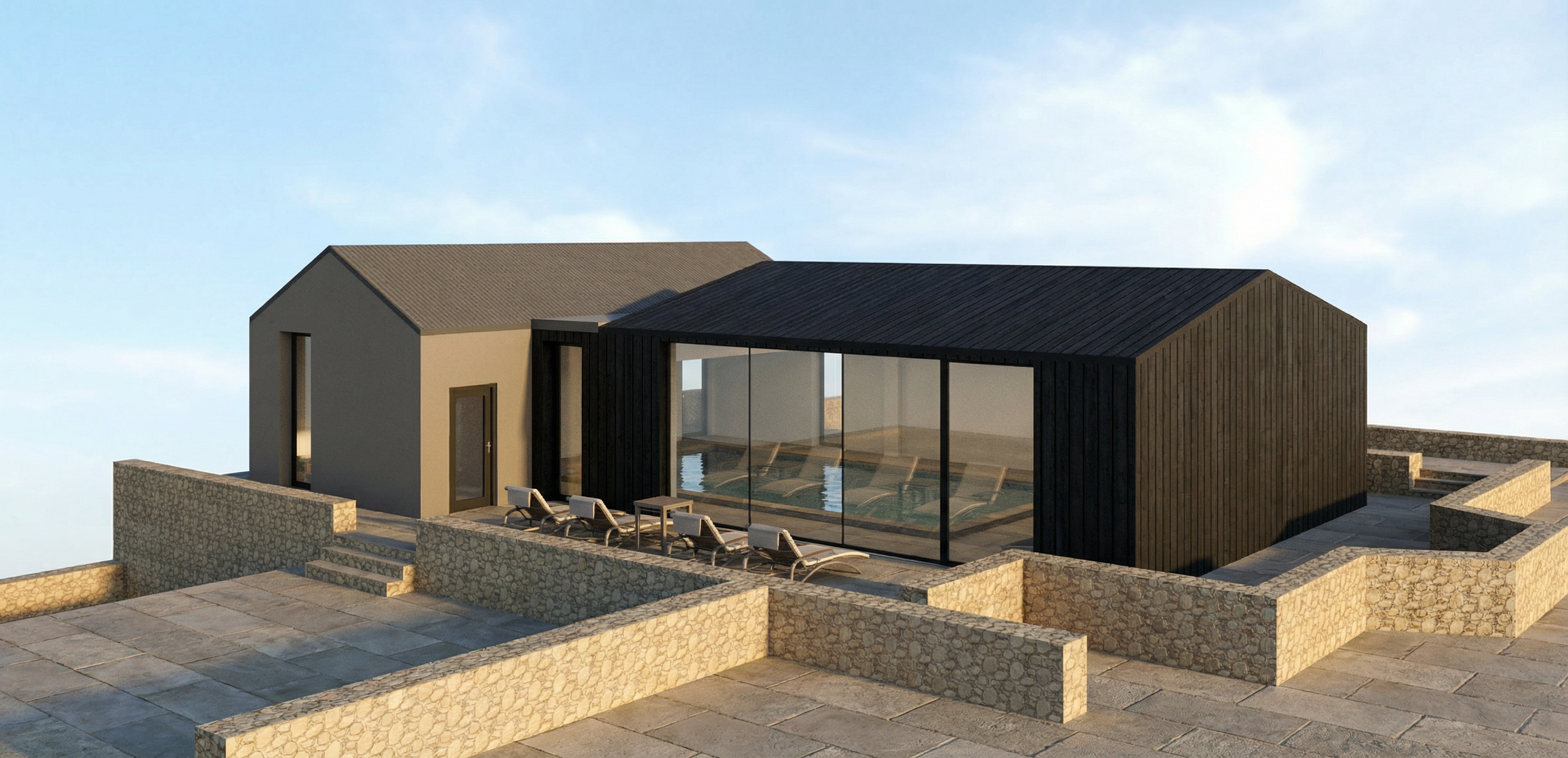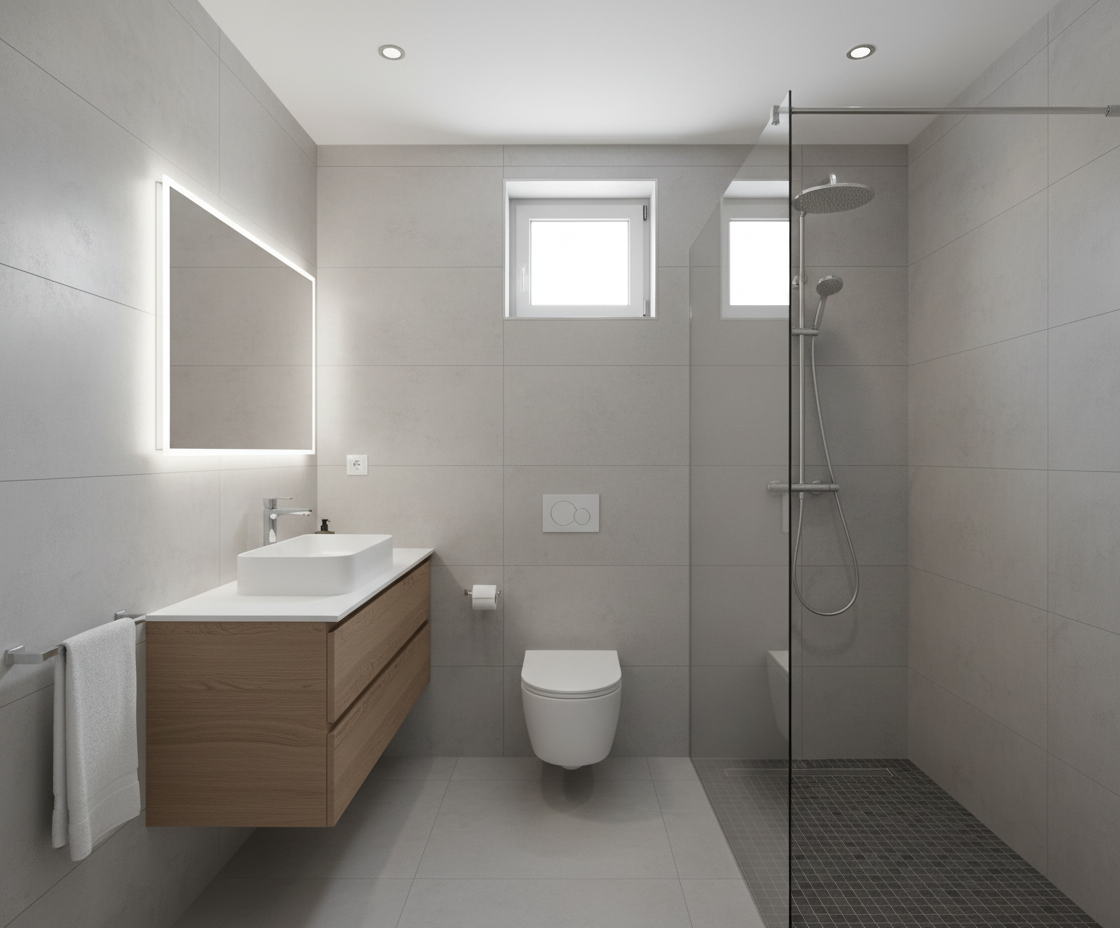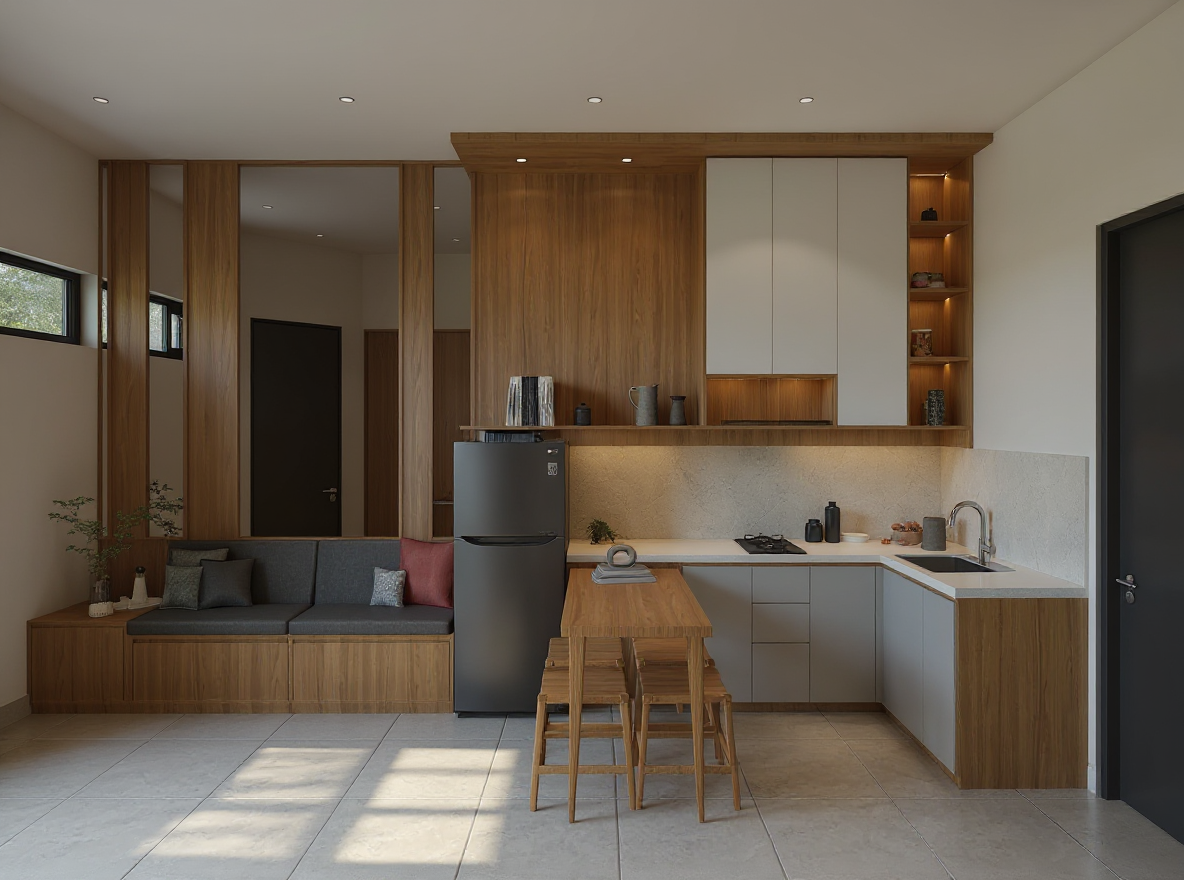 floor light natural oak in a herringbone pattern not fully whitened bleached kitchen natural oak veneer white countertop the other furniture and doors also in natural oak veneer dining table in solid wood strictly match the exact space proportions and dimensions from the reference images keep all elements as they are same sizes and placements and roughly the same colors just make it look realistic photoreal kitchen is handleless no visible pulls bookshelf should be white and filled with full of books the lower part bottom 1 3 of the bookshelf should be white handleless cabinet doors all the way to the floor no legs feet no gap flush to the floor add curtains to the windows on both sides in a light pastel green colour add a cream coloured low pile rug under the sofa handles and similar hardware elsewhere should be silver brushed stainless steel