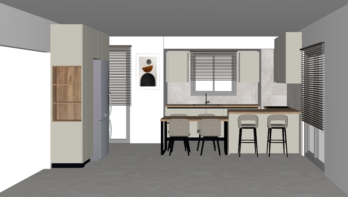 render a modern kitchen with a soft homely atmosphere use warm white for the walls and grey beige cabinets and soft wood for the countertops the floor tiles should be a light tan color incorporate large windows with natural light streaming in highlighting the greenery outside add indoor plants in pots near the windows for a fresh look the dining table should be wood with metallic chairs set with elegant tableware use hanging pendant lights above the table casting a warm glow overall ambience should be serene and inviting