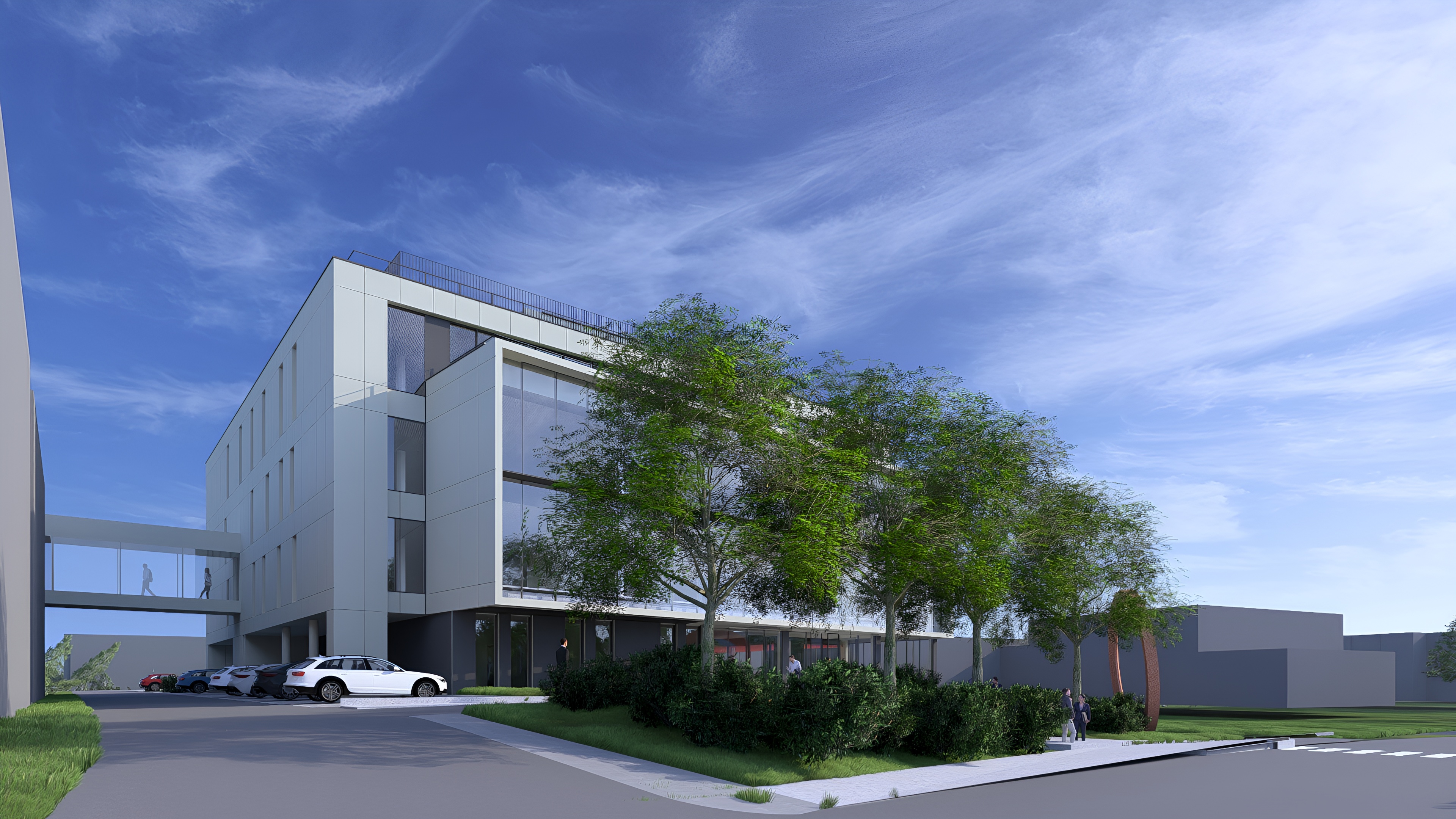 preserve the building s architecture realistic rendering of a modern office building with a large rectangular glass facade and a flat roof the non glazed facades are made of light gray aluminum gray brick base the building stands on a grassy hill with a clear blue sky in the background composed of several floors it features large windows on each level allowing natural light to filter through and creating a bright and airy atmosphere four trees are in the foreground passersby stroll around the building reinforcing the impression of movement and life architecture