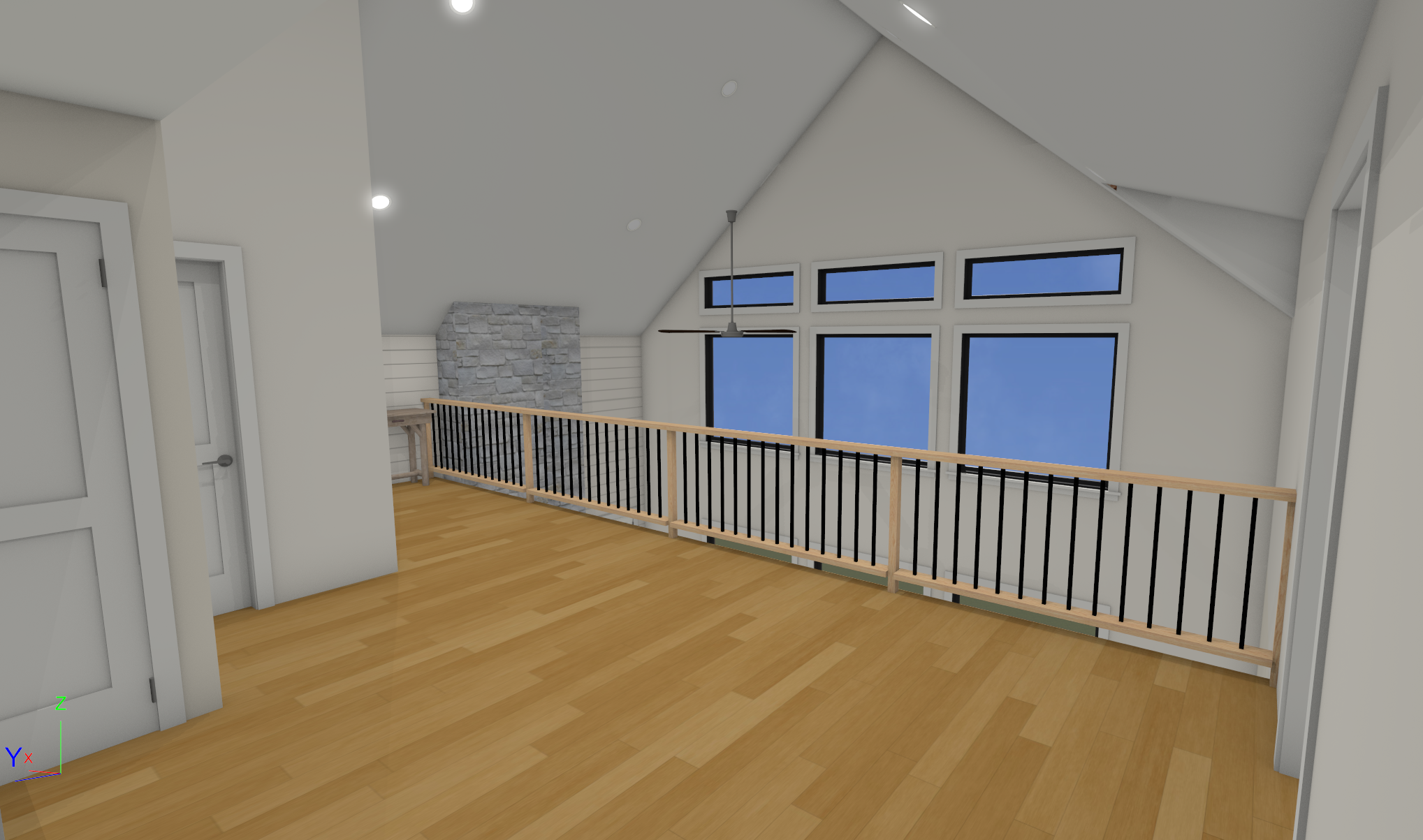 furnish this loft with transitional decor make the view out the windows many mature trees and a lake across the street