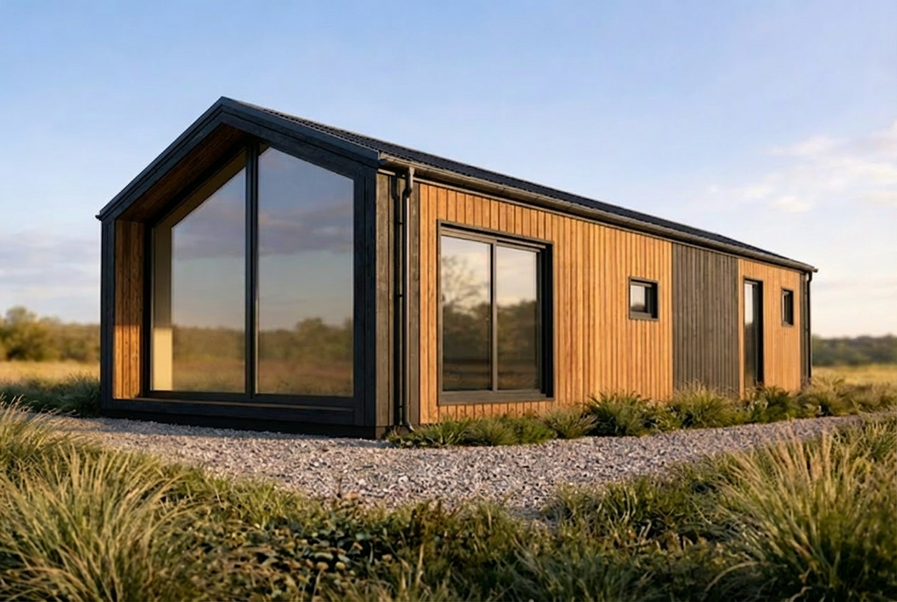 photorealistic modern tiny house in a natural grassy landscape wooden vertical cladding with black metal frame gabled roof large front glass facade gable window lowered so the bottom edge sits only 5 cm above ground level the adjacent side wall shortened by about 10 cm so it no longer protrudes beyond the front glass facade side windows and sliding doors slightly extended outward overlapping the facade more with deeper frames and more pronounced shadows clean minimalist architecture warm evening light soft shadows ultra realistic materials high detail 4k architectural visualization wide angle lens