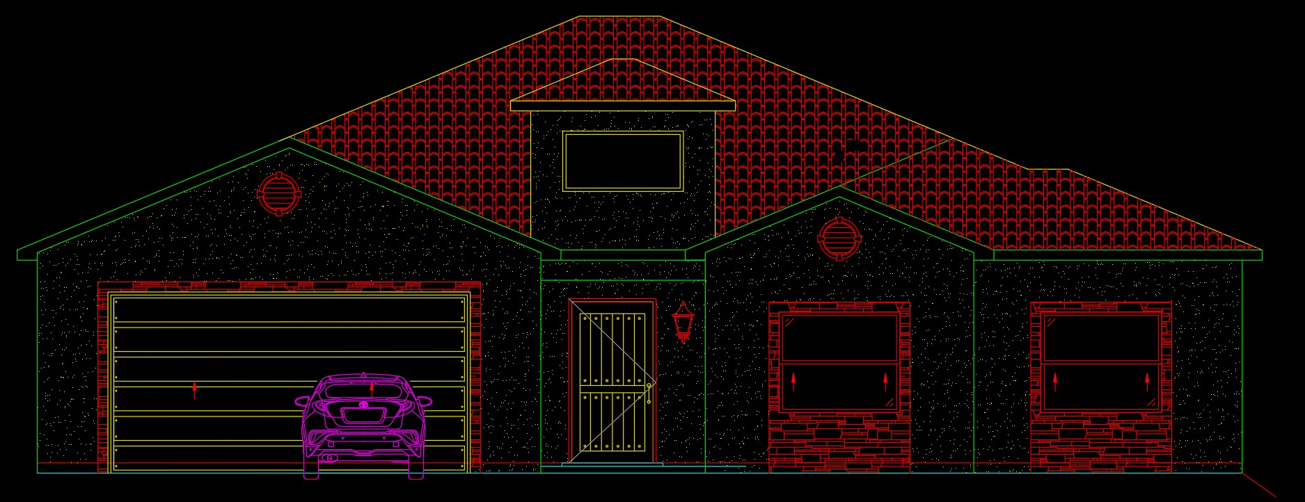 generate beautiful elevations renders with light inside with white stucco on front walls and black tile roof top down from above with sunlight at dusk