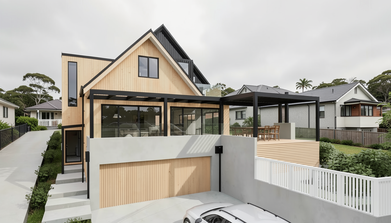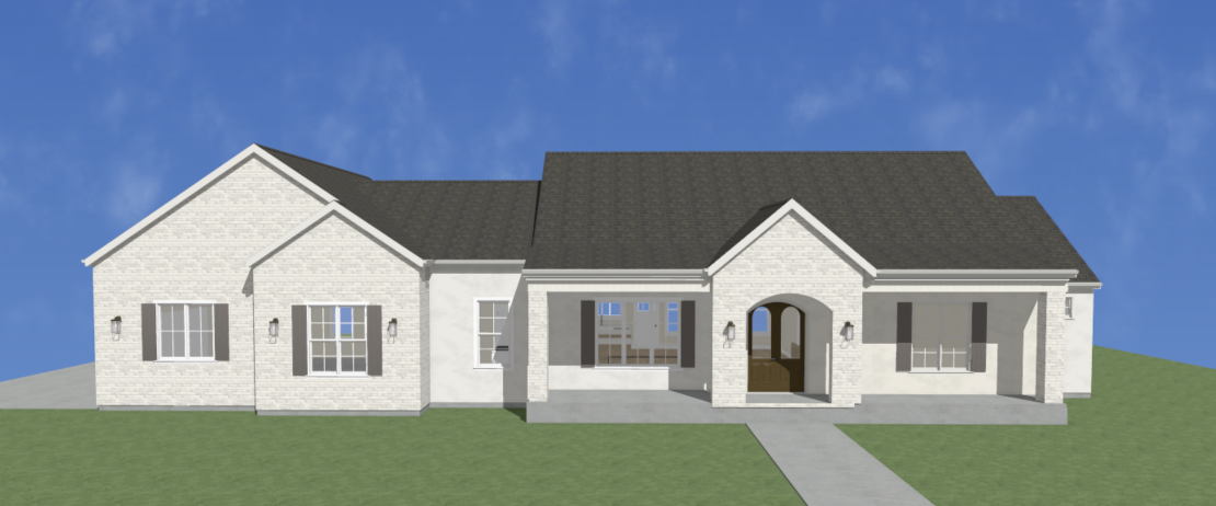a french country manor style home a dark gray brown shingle roof and white brick on the front of the house gray brown shutters a manicured lawn with pine trees scattered behind the house mountain behind the trees a few native plants in the landscaping