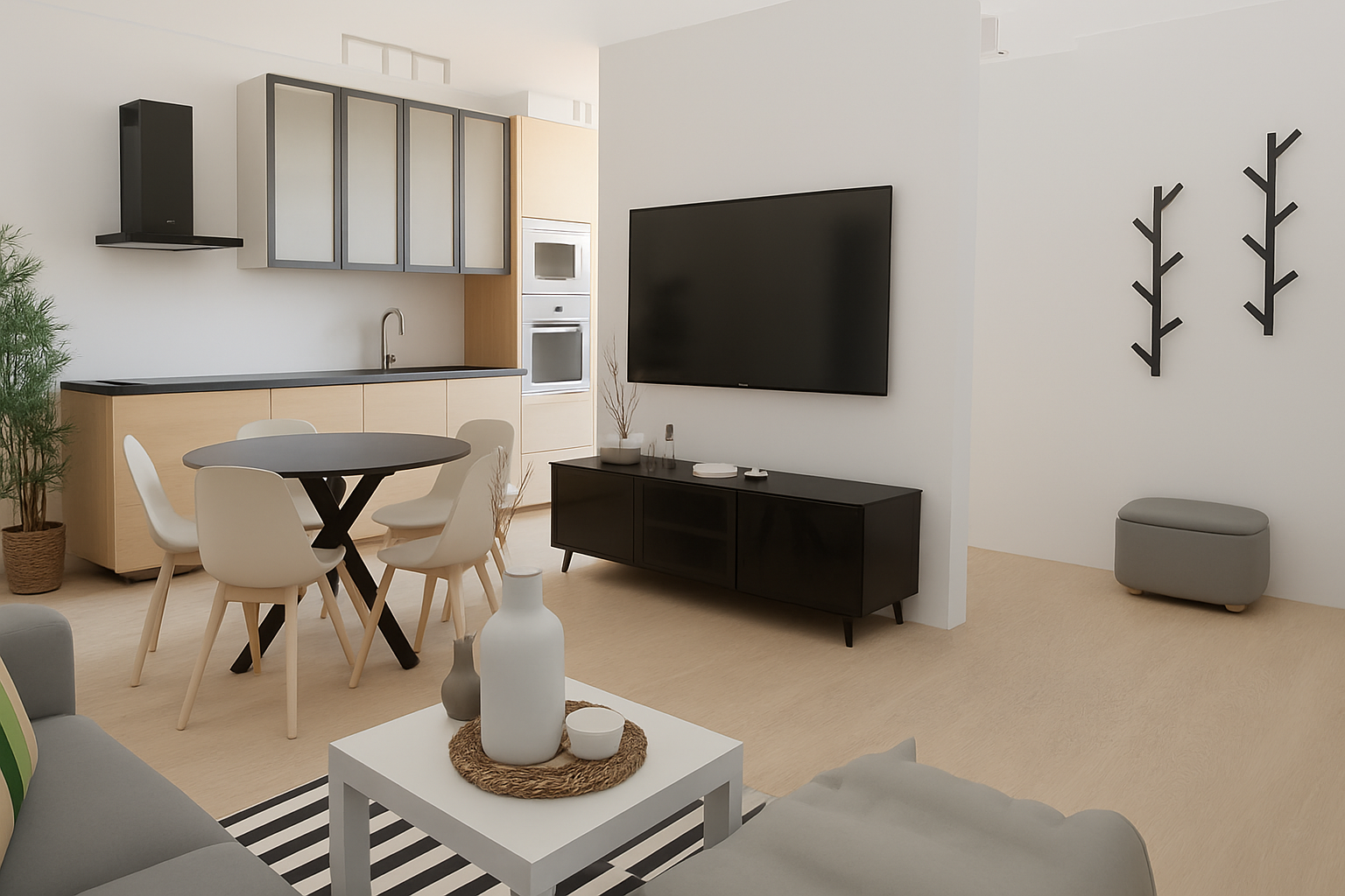 interior shot classic beautiful living room kitchen we reach the kitchen under a walnut arch at the front right the breakfast bar is also walnut brown with light bar stools the kitchen is light brown the back is brownish beige marble there are both lower and upper cabinets on the back wall above the hob there is a window put the sky and trees behind it to make the view beautiful the floor is medium brown parquet on the wall behind the sofa and on the propelling column next to the sofa there is structured brownish beige wallpaper the upper part of the protruding column is a walnut brown shelf part other walls are cream the sofa is deep blue filling the distance between the wall and the protruding column a picture hangs on the wall the armchair by the fireplace is light gray the dining table is walnut brown