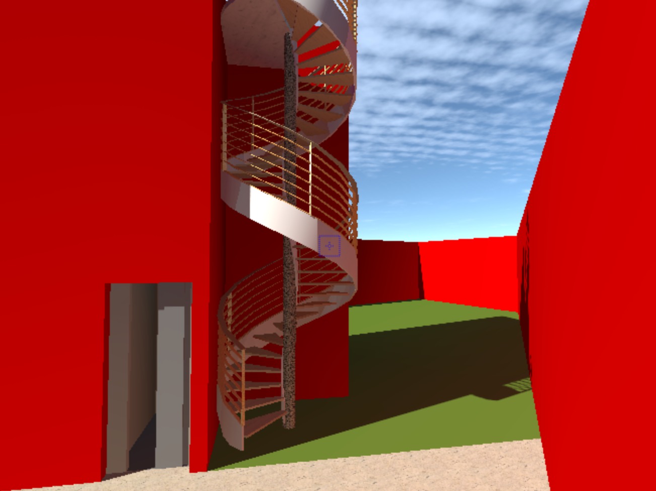 circular exterior staircase with a metal stringer and steps made of irving steel grating the design should look modern with very clean and refined lines include a simple wrought iron railing that feels minimal yet elegant surround the staircase with garden landscaping for ambiance add indirect lighting integrated into the steps to create a subtle glow the metal stringers should be lacquered in a dark gray finish put the door of the elevator to the left side of the stairs change the railing for one more clean and modern