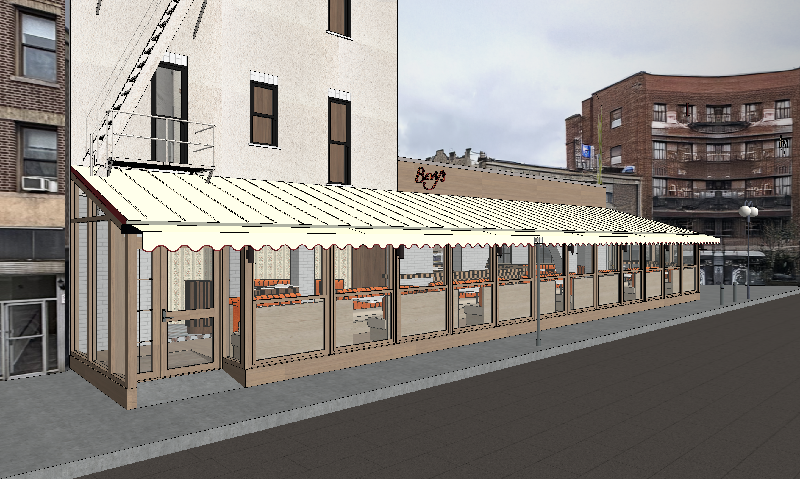 ultra photorealistic daytime exterior render of the bevy s restaurant in new york preserving the exact architectural proportions and layout of the model a beige standing seam metal roof with soft warm tonal variation paired with a beige fabric awning featuring a clearly visible deep maroon scalloped piping along the lower edge a long glass storefront constructed from light oak wood frames with natural grain detail including light oak mullions transoms and base panels the interior visible through the glazing showing orange channel stitched banquettes and detailed patterned flooring subtle fa ade window line spotlights mounted on the wood structure and the bevy s sign rendered as a thin continuous red neon tube perfectly following the handwritten outline of each letter bright glowing with a soft red halo similar to the reference neon image the entire scene is illuminated by clear midday sunlight with crisp shadows realistic highlights and reflections on the glass high resolution texture for wood neon metal and fabric and a typical new york backdrop with brick buildings and natural daylight atmosphere