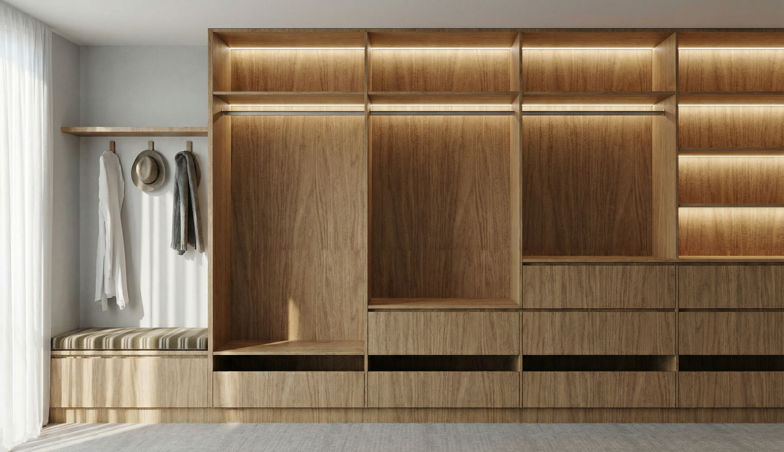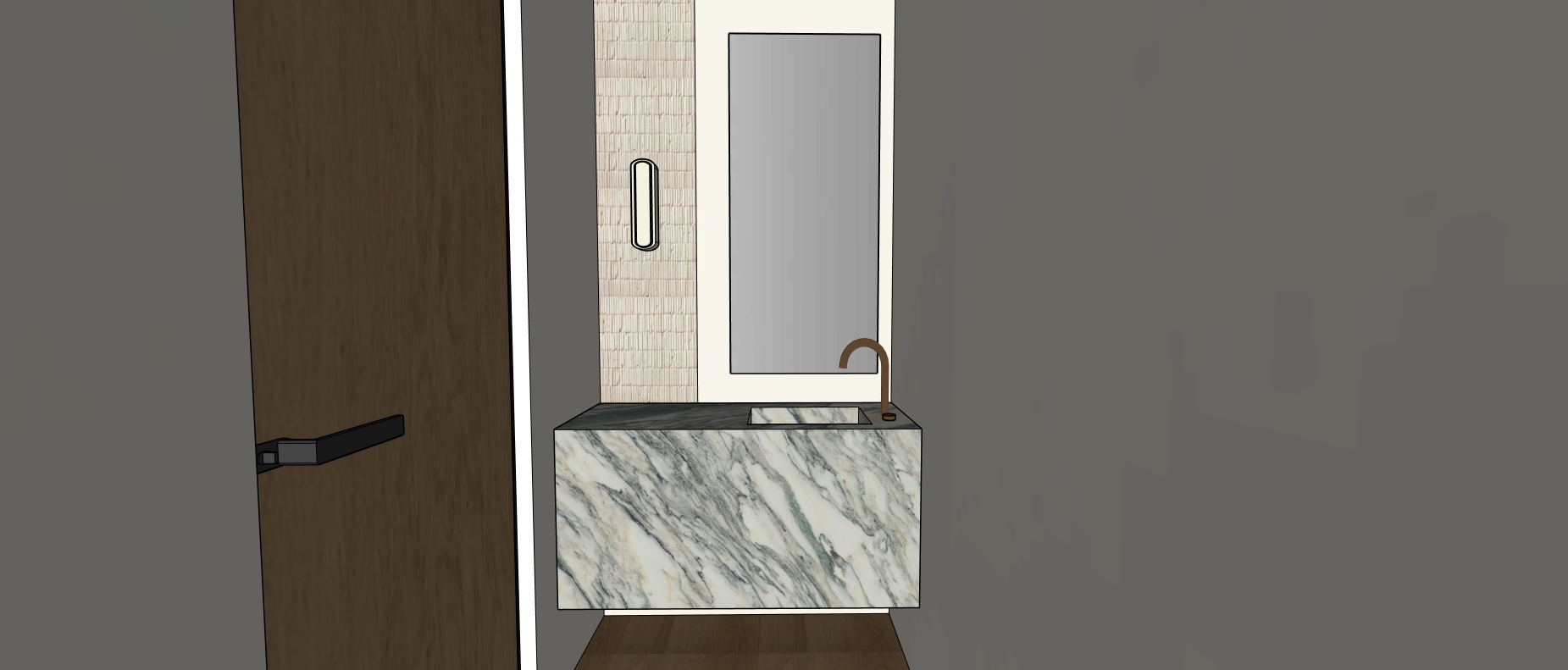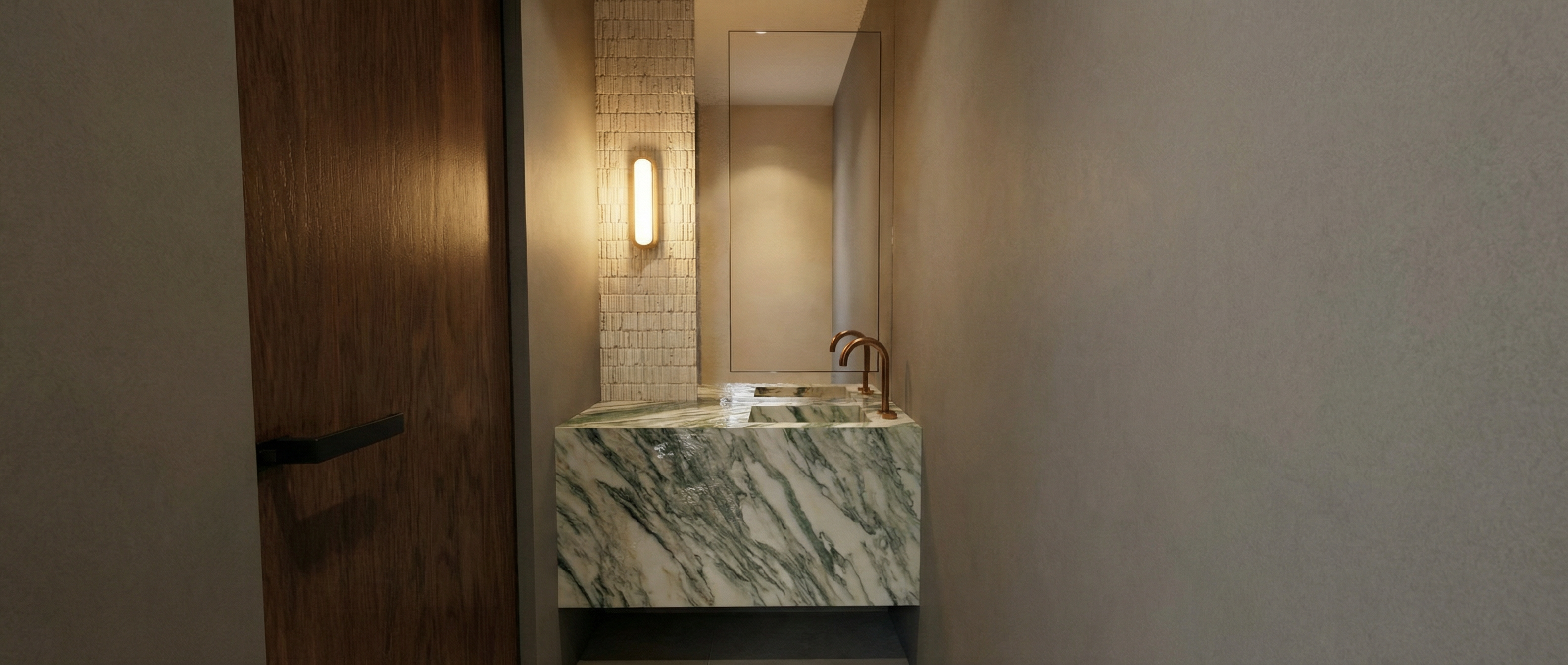 use provided sketchup model exactly as is with zero redesign zero geometry changes and zero material replacement preserve all proportions object placement and camera angle exactly from the sketchup scene only apply physically based rendering and realism enhancement render as a high end architectural digest style interior photograph of a luxury powder room with a quiet minimal moody aesthetic the space is lit using hidden architectural lighting only soft recessed ceiling lighting not visible a warm 2700k wall sconce as a subtle accent on the left tile wall and a very soft under vanity led glow to create a floating effect lighting should be low warm and atmospheric but still clearly readable with no crushed blacks and no overexposure the floating vanity is clad in green oasis marble with rich emerald veining realistically lit with soft highlights and natural reflections the mirror is a narrow vertical borderless slab mirror perfectly flat no frame no bevel no distortion and no added hardware left wall features vertical bianco antico tile that stops cleanly at the top of the vanity with a precise horizontal termination line no tile continues behind or below the vanity below that line is smooth plaster only walls are finished in soft white roman clay plaster with subtle texture variation flooring is wide plank natural white oak with matte finish the interior door matches the flooring exactly in tone and material with matte white oak veneer and minimal presence a slender aged bronze water column descends from the ceiling above the sink it is completely independent and not connected to the wall on the wall there is only one small minimal circular bronze control element flush and understated not part of any faucet system lighting must feel like a real luxury residential powder room at night layered soft moody and physically accurate with global illumination natural falloff and realistic shadow behavior no daylight no visible fixtures except the wall sconce no over bright showroom lighting and no flat cgi illumination ultra realistic v ray corona style rendering architectural digest editorial quality 8k resolution physically based materials subtle imperfections in plaster marble veining and reflections for realism