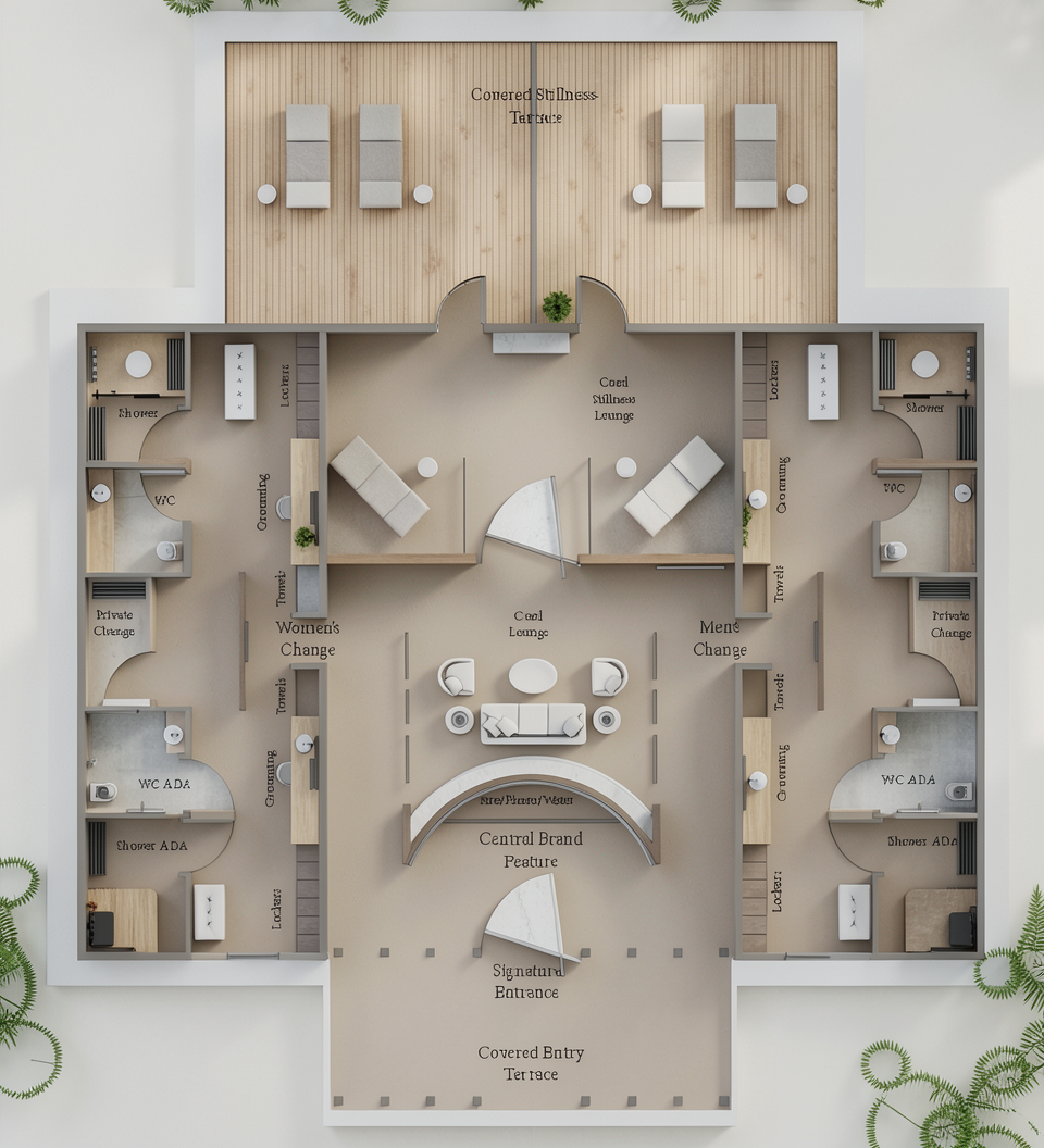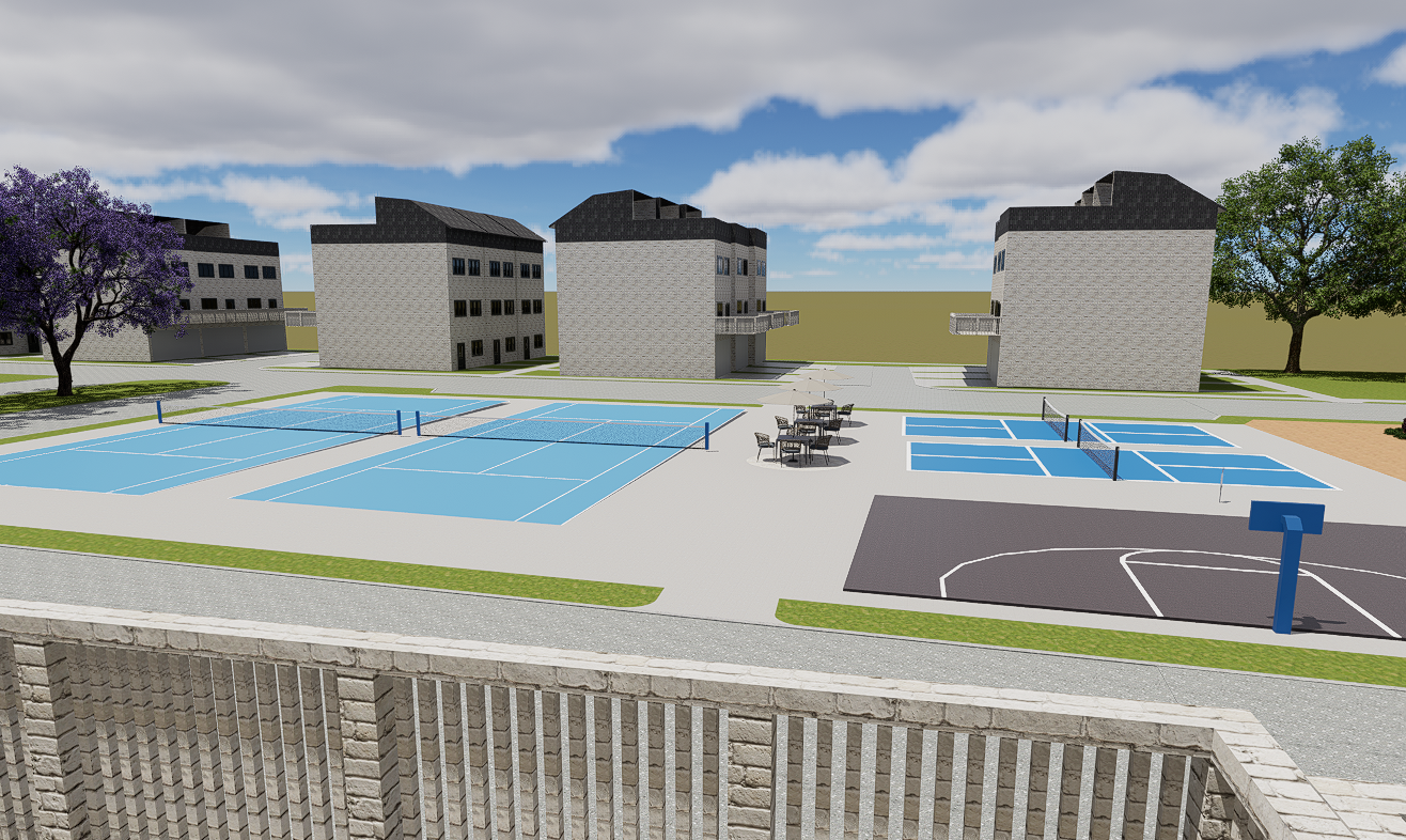 fully render the view off this balcony add not in front of the balcony but around the homes in the background leave the colors of the tennis courts and basketball courts the same also a 10 people put a black iron fence in the grass around the area