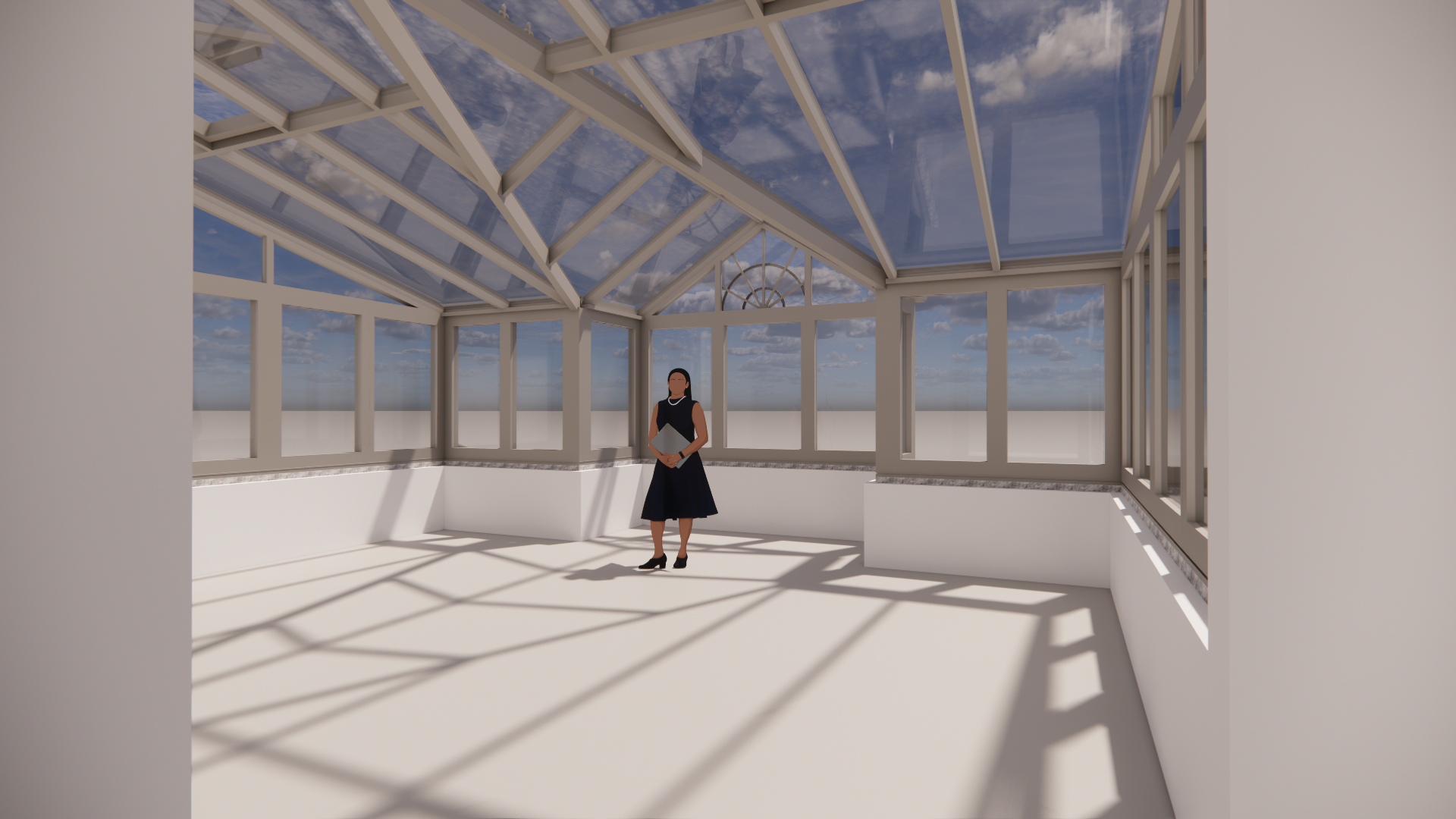 modern sunlit room with large windows beige walls and glass ceiling soft sunlight casts intricate shadows on white floors a person stands elegantly wearing a dark navy dress and black shoes holding a light gray folder the atmosphere is serene and airy with a clear blue sky visible through the windows giving a sense of tranquility and openness cozy living room furniture to fill in the conservatory without plants