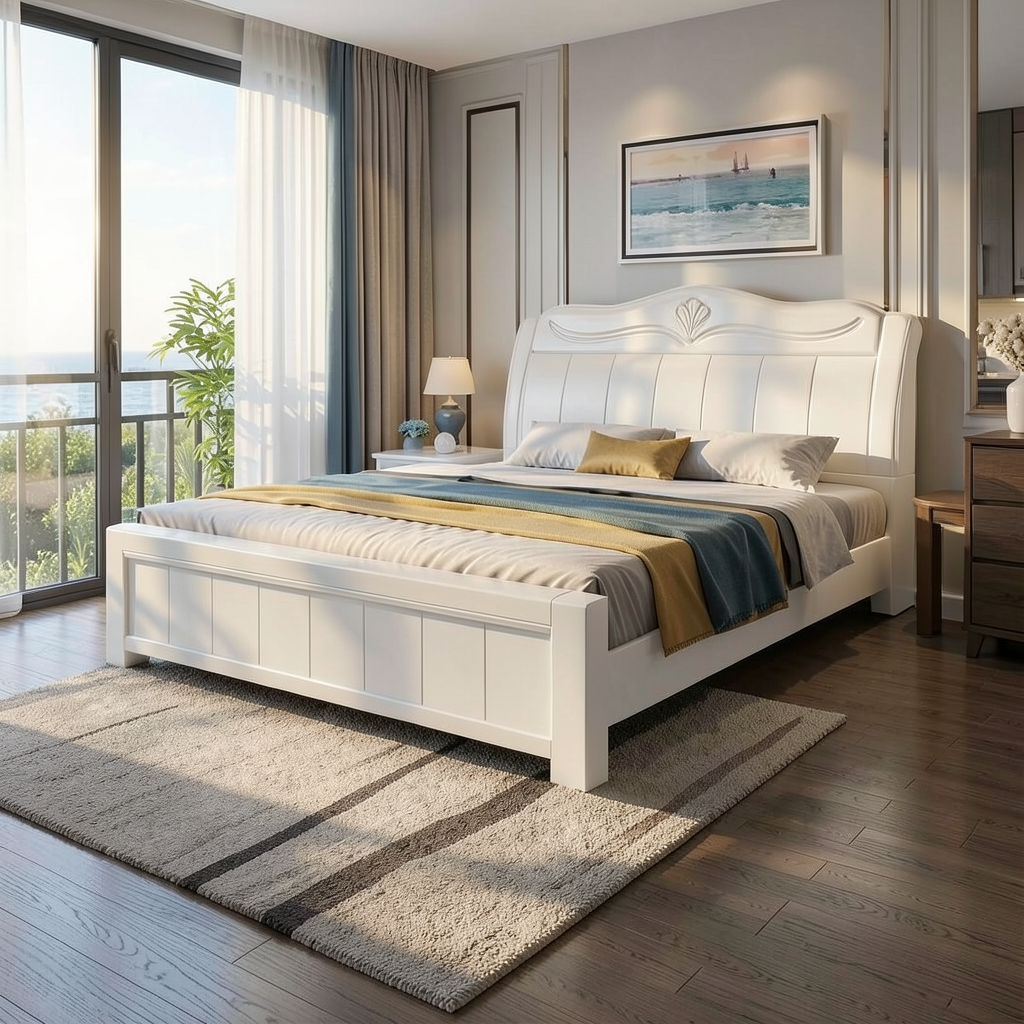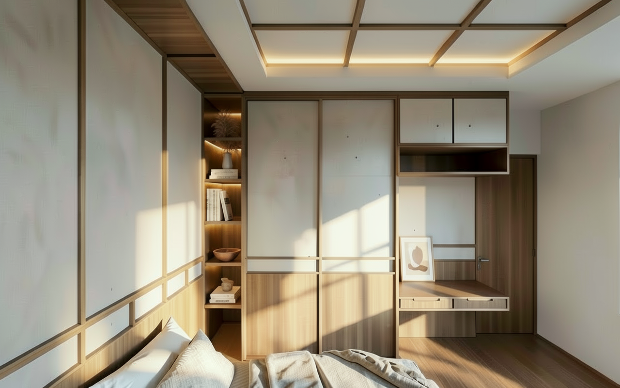 refine this image while strictly preserving the existing composition camera angle and geometry do not reinterpret or redesign the architecture corrections required replace the shelf above the bed with a linear led light fixture integrated into the wall no shelf minimal and elegant design ensure the patient is lying in the bed in a natural resting position not standing the vertical panel behind the bed must be natural light wood veneer not painted with a subtle grain and warm tone the wardrobe doors on the left must match the same wood veneer material and color for a consistent design materials floor light beige natural linoleum soft matte finish not wood flooring furniture keep minimal white medical furniture lighting maintain soft natural daylight from the window keep a calm warm and elegant atmosphere style high end contemporary healthcare interior realistic minimal architectural magazine quality precise and coherent material definition