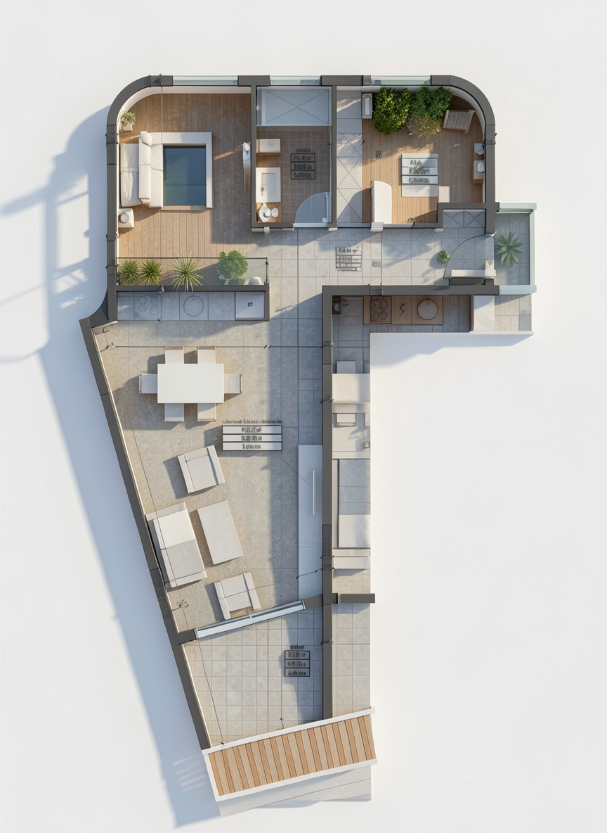 architectural photography ultra realistic 8k resolution cinematic lighting maintain original geometry walls smooth knot free clt panels in a light yellow wood tone floor seamless beige microcement curtains translucent white linen soft light diffusion lighting soft morning sunlight streaming from the window in the front kitchen island semi matte natural stone dining table matte knot free oak wood pendant lamps white cocoon fabric texture with a subtle visible inner structure highly detailed textures realistic grain soft shadows