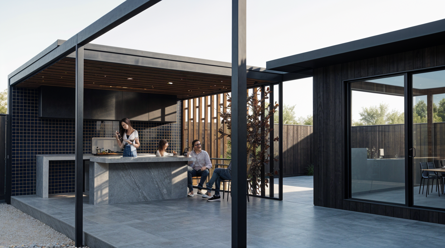 make building black and add two story deck the building on the right and add corvette stingray 1968 and f150 raptor under carport
