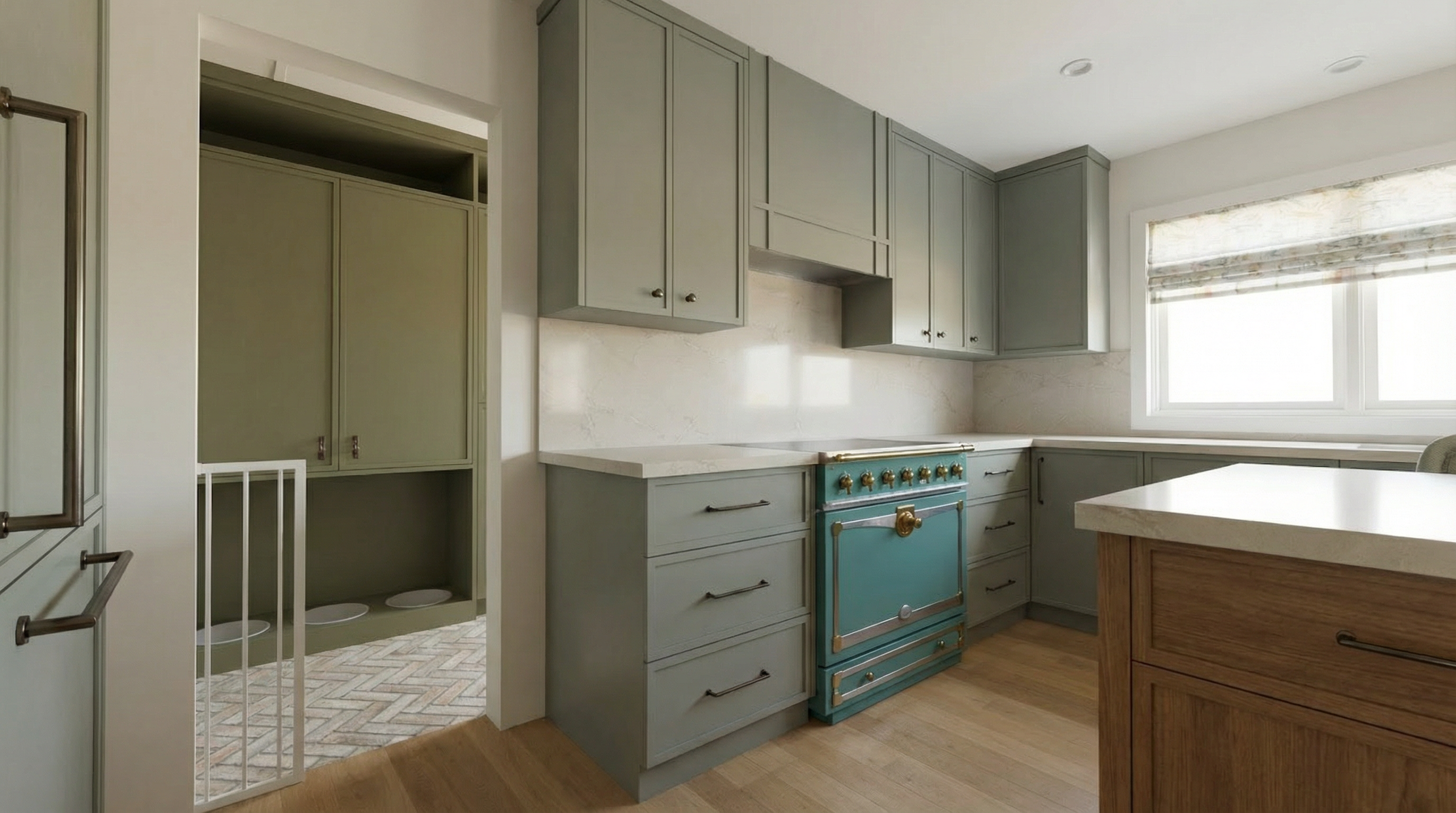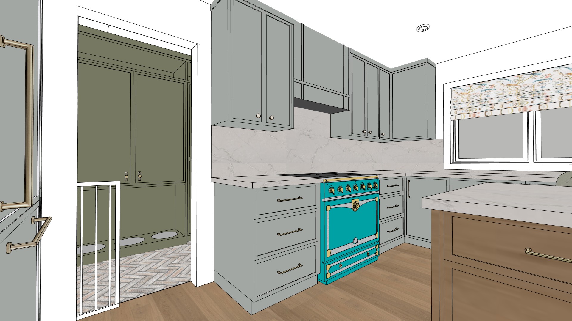 render a photorealistic interior kitchen scene exactly as shown in the reference image with no changes to layout colors materials objects proportions or finishes this view focuses on the cooktop wall and adjacent island featuring soft sage green green gray shaker cabinetry with recessed panels and slim dark metal pulls upper cabinets extend to the ceiling evenly aligned with a concealed hood integrated into the cabinetry above the cooktop the backsplash and countertops are made of a light off white stone slab with subtle natural veining matte to satin finish installed seamlessly with clean edges at the center of the scene is a freestanding statement range in a teal turquoise enamel finish with brass knobs handles and trim positioned flush between base cabinets the cooktop surface is black flat and integrated into the range with no visual clutter the central island partially visible on the right is finished in natural warm wood with framed panel detailing and a light stone countertop matching the perimeter counters drawer fronts panel proportions and hardware remain exactly as shown the flooring is light natural oak wood wide plank with a soft satin finish and realistic grain variation to the left a doorway leads to a pantry or adjacent room featuring olive green built in cabinetry and a herringbone patterned tile floor in light neutral tones a white child safety gate is installed in the doorway remaining exactly as positioned on the right wall a window above the sink area allows natural daylight to enter dressed with a light fabric roman shade featuring a subtle floral or organic pattern softly diffusing the light lighting is natural and balanced combining soft daylight with ceiling recessed lighting shadows are realistic gentle and consistent with real interior photography camera angle is eye level with natural perspective no distortion realistic depth of field and professional interior photography composition ultra high resolution photorealistic render physically accurate lighting realistic textures true material behavior clean lines calm upscale residential atmosphere