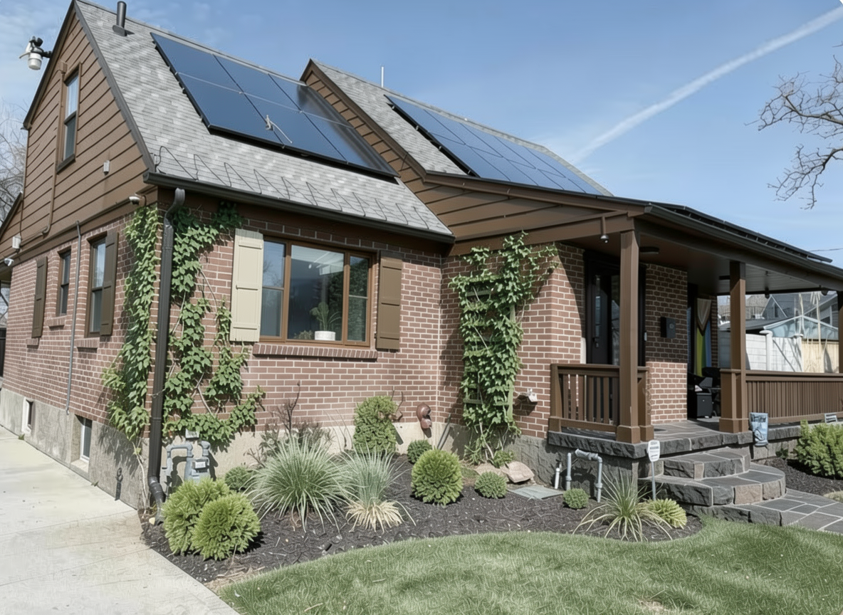 add flanking gravel parking with a few high end cars and a landscaped patio with trimmed hedges in front show people wearing yoga clothes