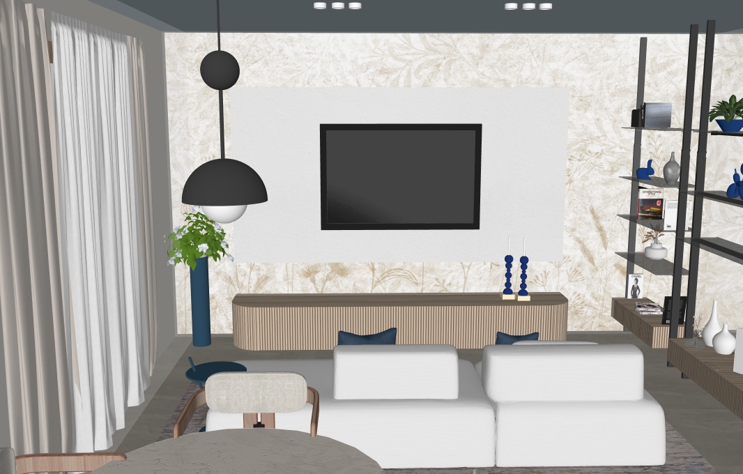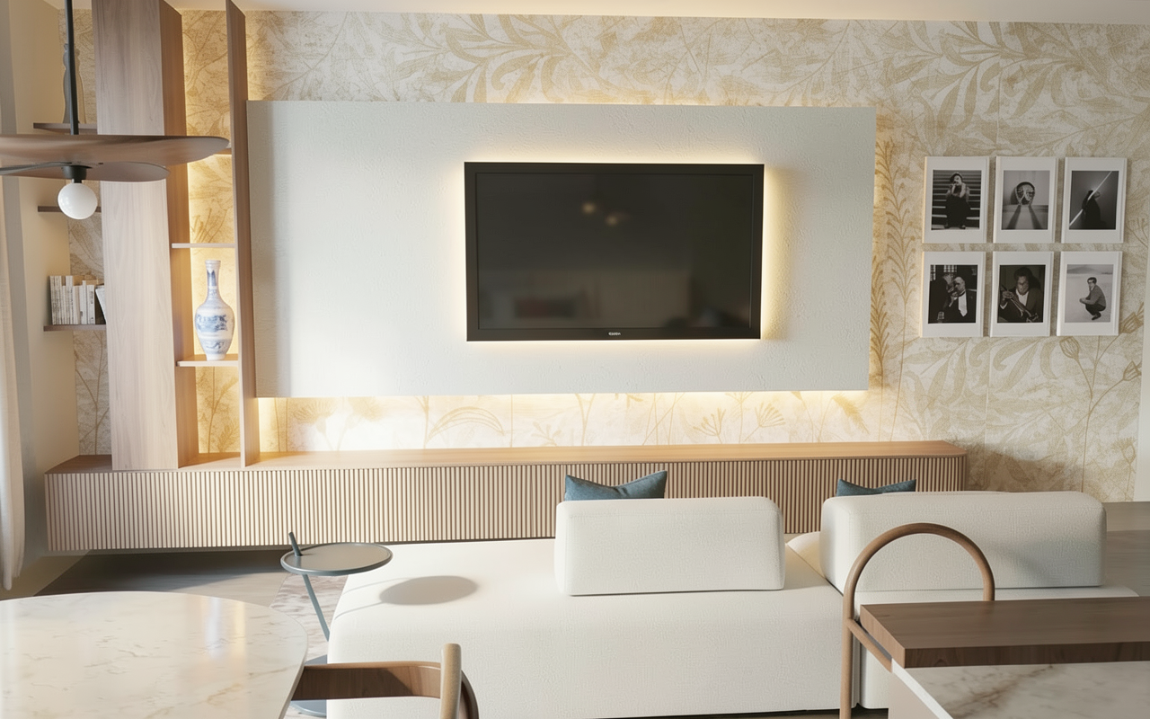 make the wallpaper lighter realistic do not change anything make it much more realistic like a photograph led light just behind tv panel