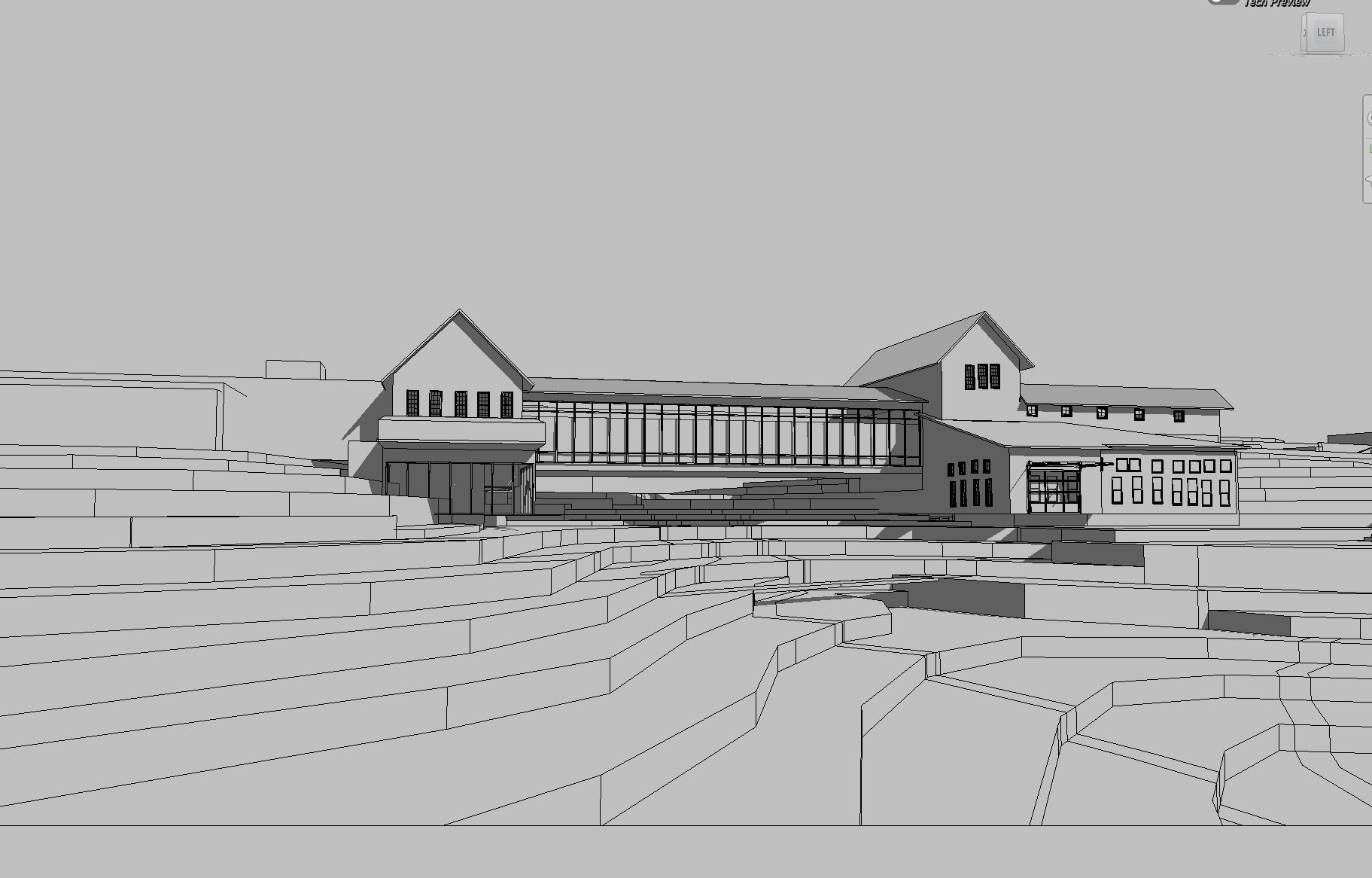 industrial building design rustic grain elevator with metal framing and vertical wood shiplap building naturally placed in hillside with tall grass fog trees in background