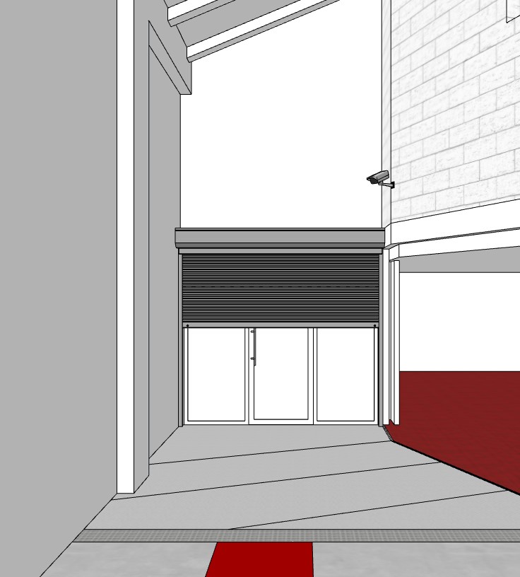photorealistic interior architectural render of a garage entrance area door and shutter area the main entrance features a three panel door finished in clean matte white lacquer with a minimalist stainless steel handle positioned above and partially lowered in front of the door as shown in the original layout is a heavy duty galvanized steel rolling shutter the horizontal slats and the upper header box must show a realistic zinc coated metallic texture with characteristic matte crystalline patterns floor treatment foreground and intermediate the floor area directly in front of the white door is made of high resolution aluminum diamond plate checkered plate the texture must be sharp including visible round head fixing rivets along the panel joints the existing horizontal drainage grate is maintained in dark metal from this channel toward the immediate foreground the floor transitions to industrial polished concrete in light grey featuring a crisp slightly weathered bright red painted stripe centered in the path right side area access to garages the section on the right leading towards further garage units is rendered with a much darker gloomier and shadowed atmosphere to create contrast the geometric floor area on the right is finished in dark red klinker tiles brick red with a matte rustic finish and dark mortar joints the concrete block walls and the sloped ceiling on this side are cast in deep shadows painted in white lighting and technical details the cctv security camera on the right wall is rendered in detail grey plastic with dark lenses smooth walls are finished in sleek white paint the sloped roof eaves and structural lines remain identical to the source image clean industrial aesthetic
