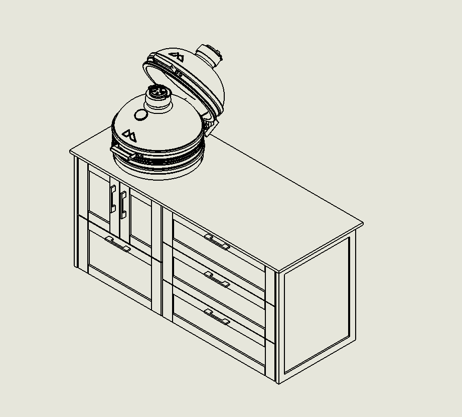 the patio to be a cream porcelain the island to be a sage green colour with a cream worktop the kamado lid to be racing green