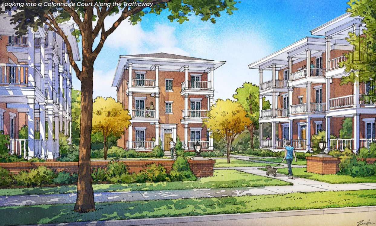 historically modern approach to urban infill kansas city apartments colonnade buildings arranged around a courtyard to create a sense of place off the road