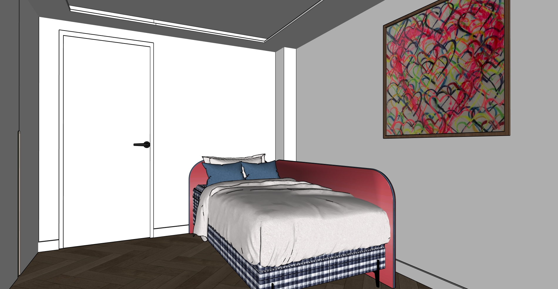 crea una imagen fotorealista a partir de este sketchup la puerta es de color blanca la parte rosa del cabecero tiene que ser de terciopelo manten la linea azul que lleva por encima