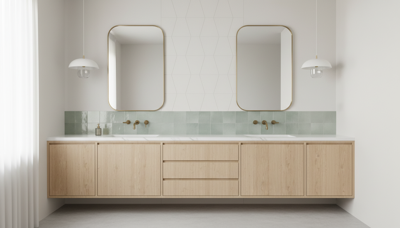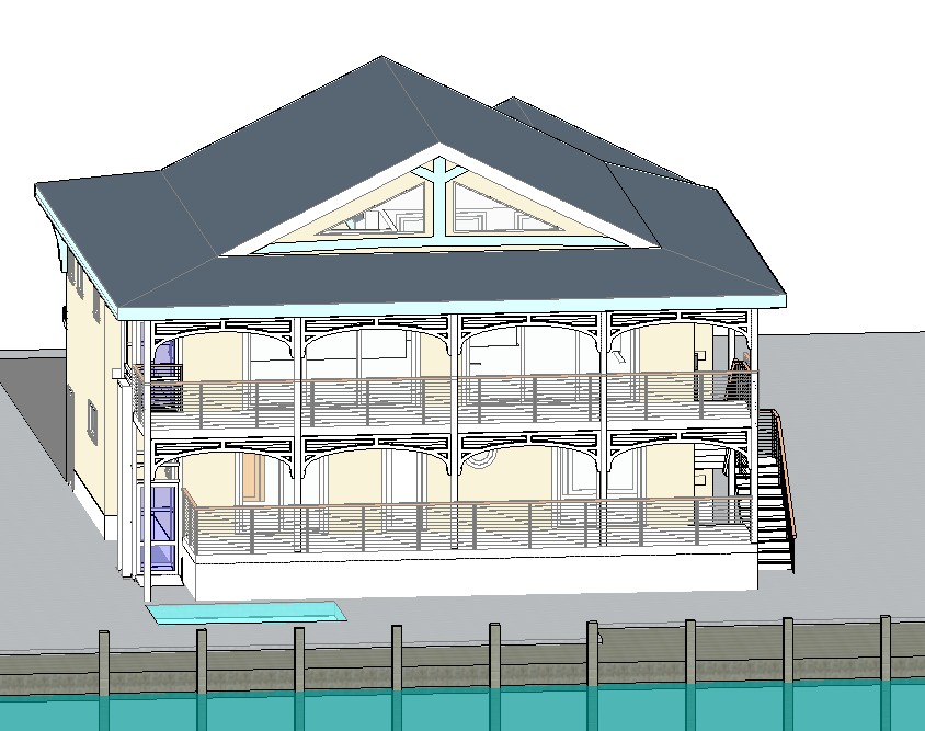 home has pale yellow walls with white trim the roof is pale teal metal the dock in front of the house is solid concrete and there is a very small pool in front of the house between the dock and the house on the left side between the house and the dock there are pale tan pavers the rest of the yard consists of tropical shrubs and coconut palms the sky has a few puffy clouds and it is late afternoon