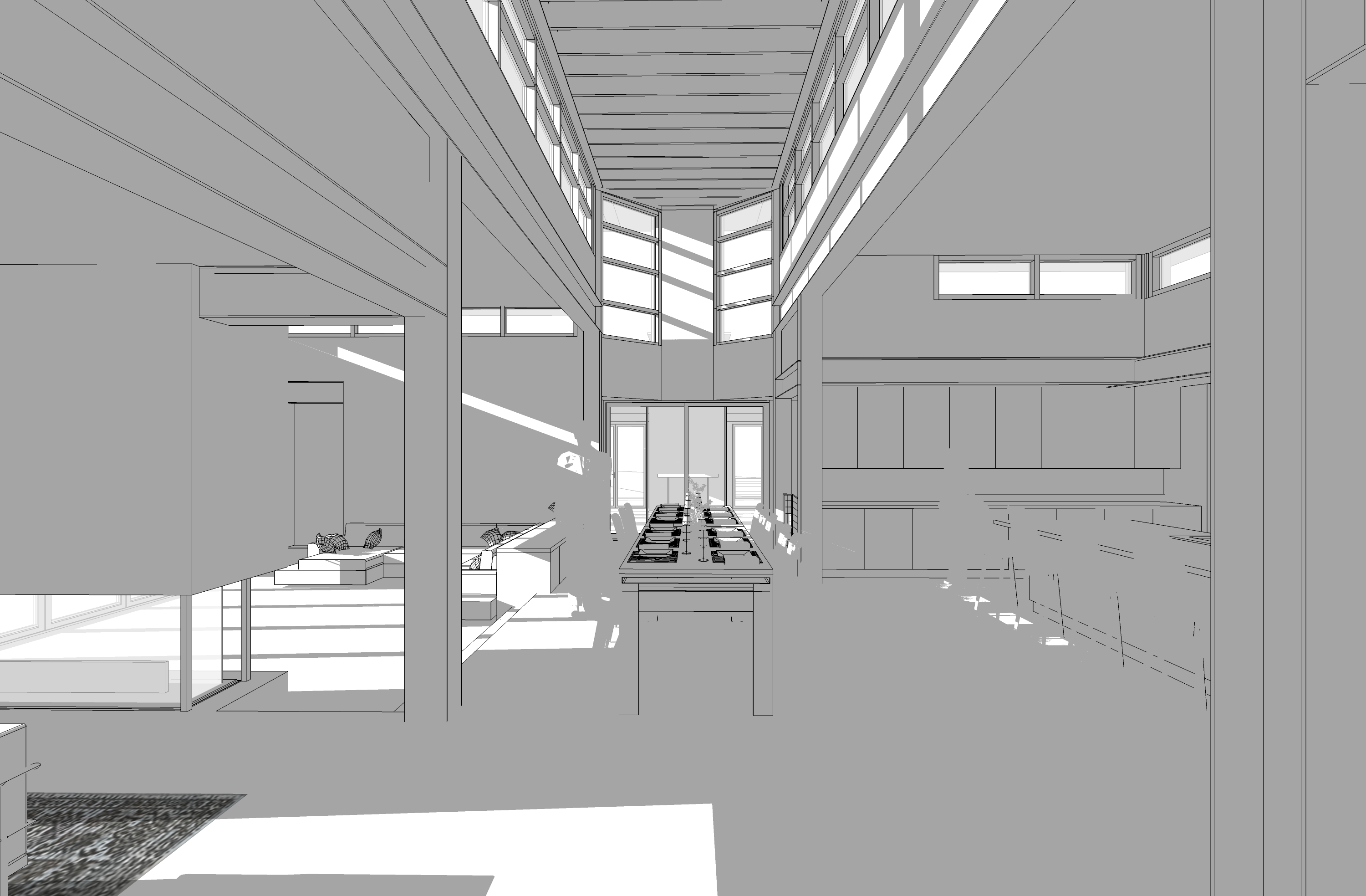 interior view matte concrete floors wood ceiling matte black steel framing matte wood cabinetry corten steel fireplace color furniture