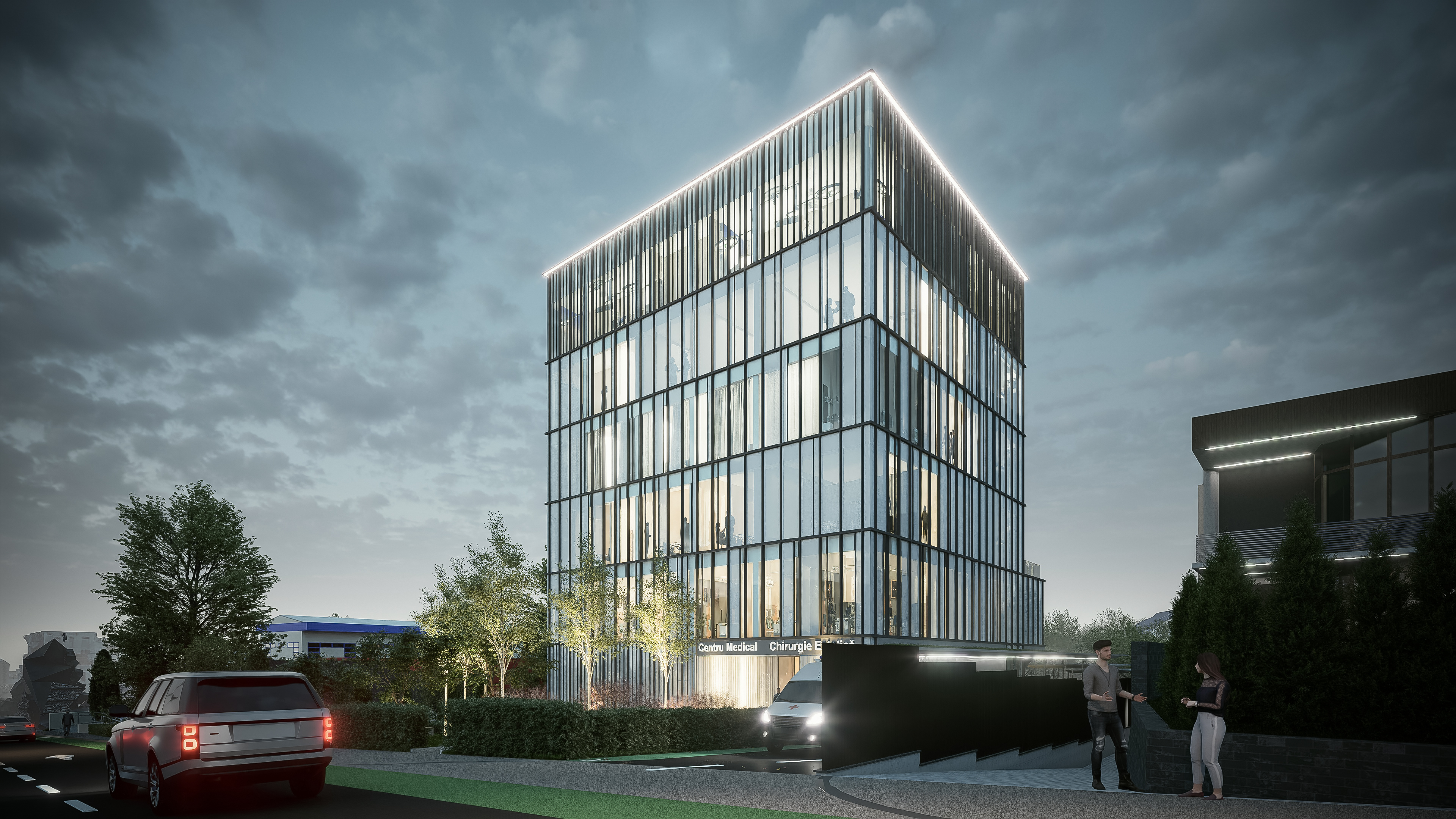 contemporary mid rise residential building modern european architecture symmetrical facade with exposed light stone concrete grid frame and dark grey volumes large glass balconies with transparent railings realistic morning sunlight from low angle soft golden hour morning light clear sky with light atmospheric haze crisp shadows with soft edges natural daylight reflections on glass subtle specular highlights on balcony railings fresh green urban landscaping small aligned street trees casting long soft shadows clean sidewalk and asphalt with subtle morning light reflections minimal traffic a few modern cars parked naturally calm residential neighborhood atmosphere ultra photorealistic architectural visualization physically accurate materials high dynamic range natural color grading balanced exposure sharp but realistic detail 8k resolution corona v ray style render