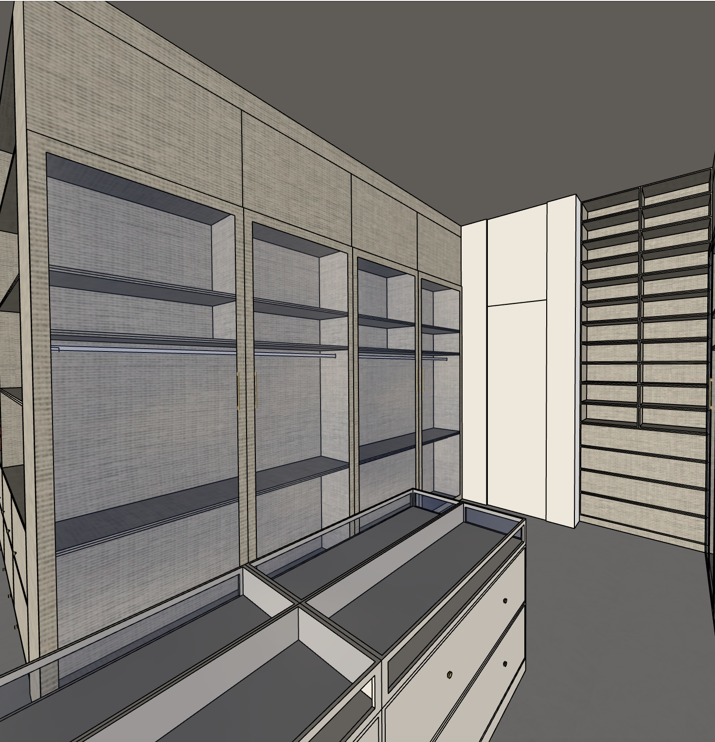 a modern interior dressing room with a luxurious and serene atmosphere render the ceiling in a soft off white the walls should be a warm beige creating a cozy yet elegant backdrop the shelving units on the left in soft light beige linen texture sophisticated touch add transparent glass elements to the shelves on the right design the center island with cream colored cabinetry enhance the drawer handles with gold accents employ soft ambient lighting for an inviting glow