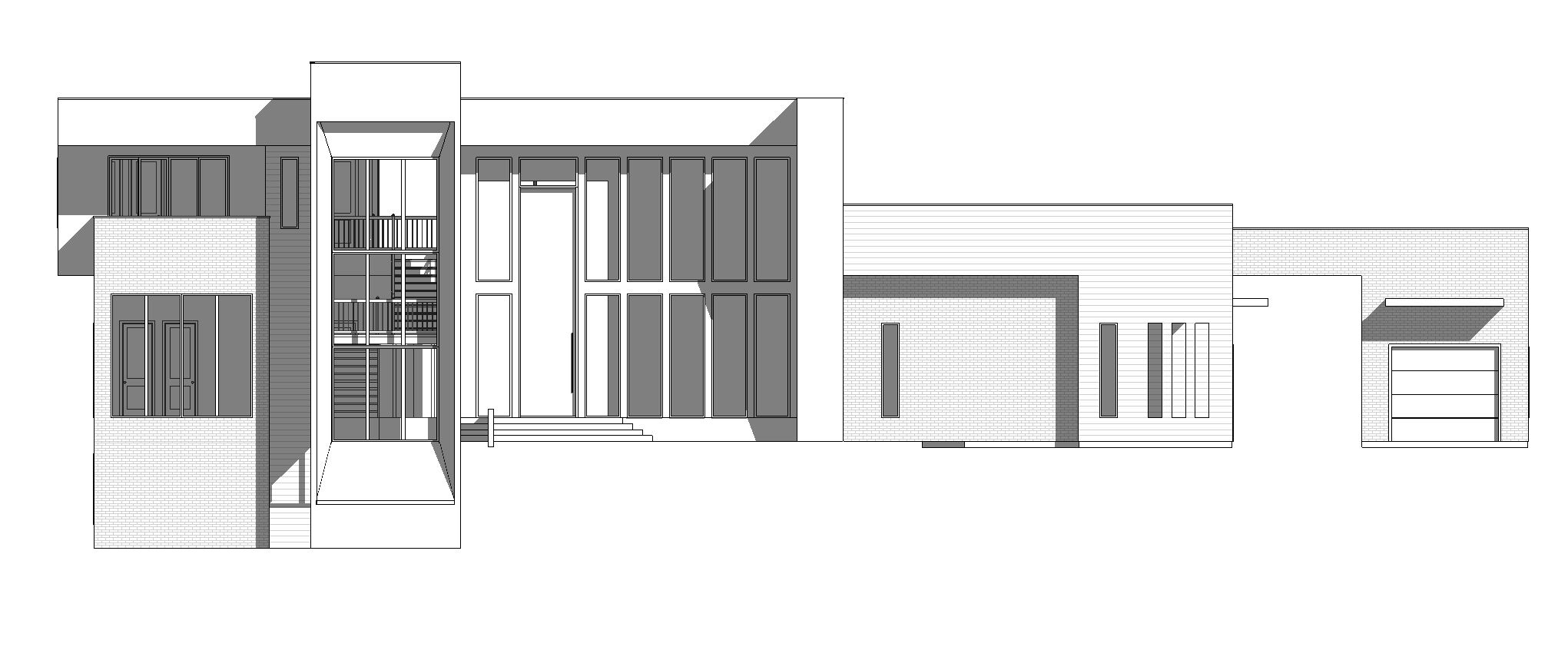 modernist exterior shot a modern clean looking house front elevation with a combination of smoky dark gray brick white stucco and dark brown horizontal wood dark colored windows and doors frame a plush front yard landscape on a sunny day in an atlanta suburban area architecture