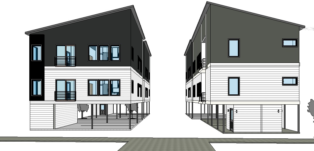 modern townhomes with shared driveway with trees in background