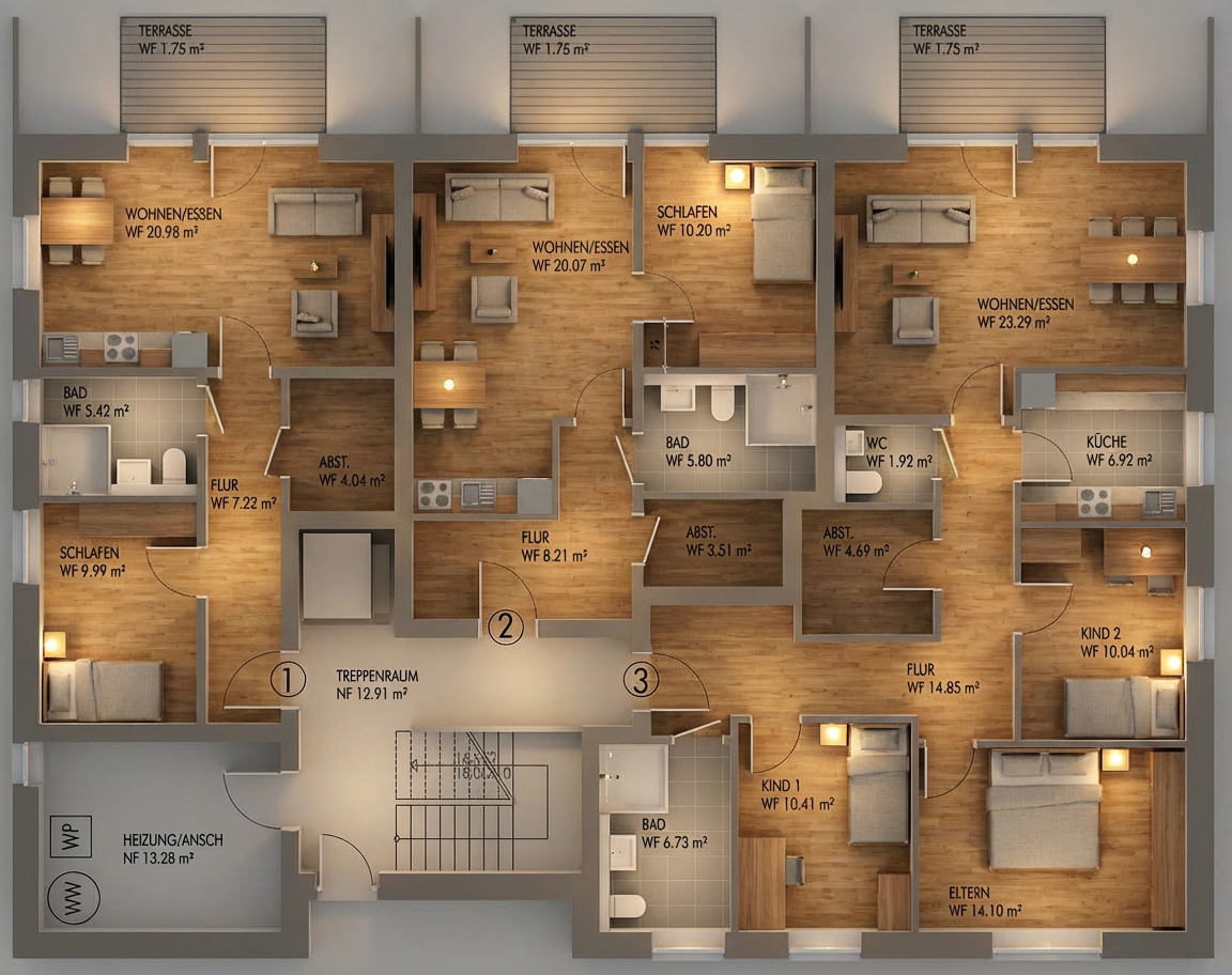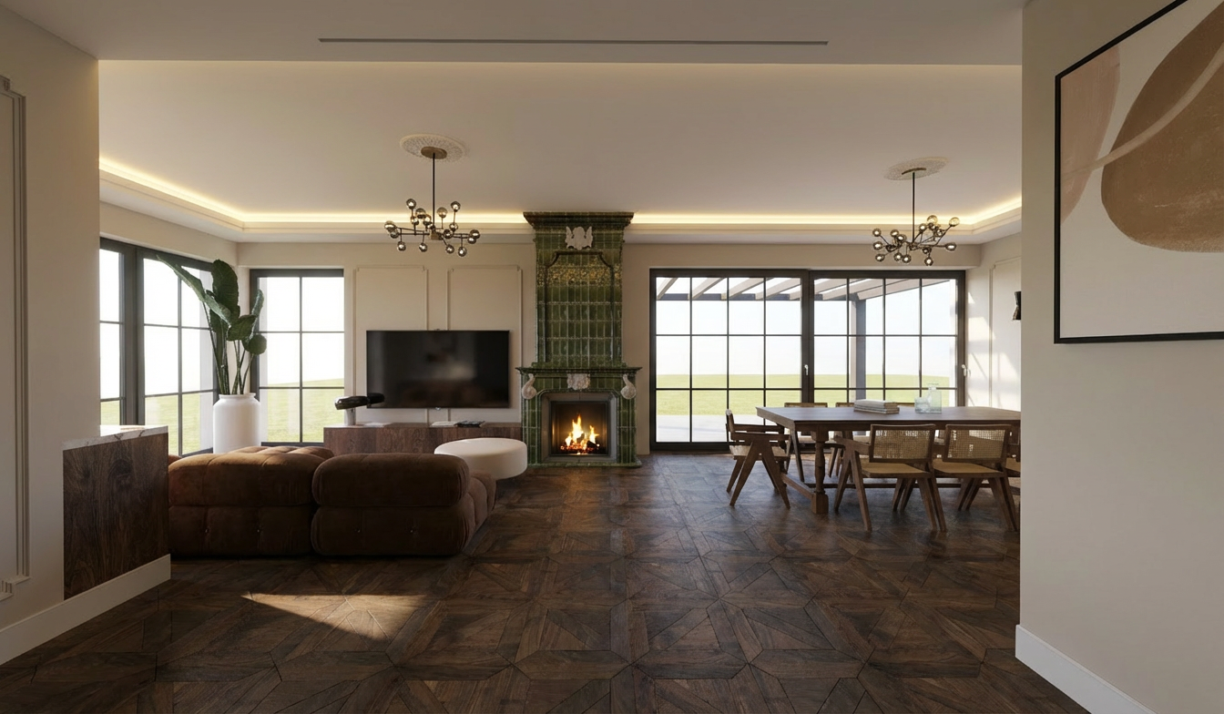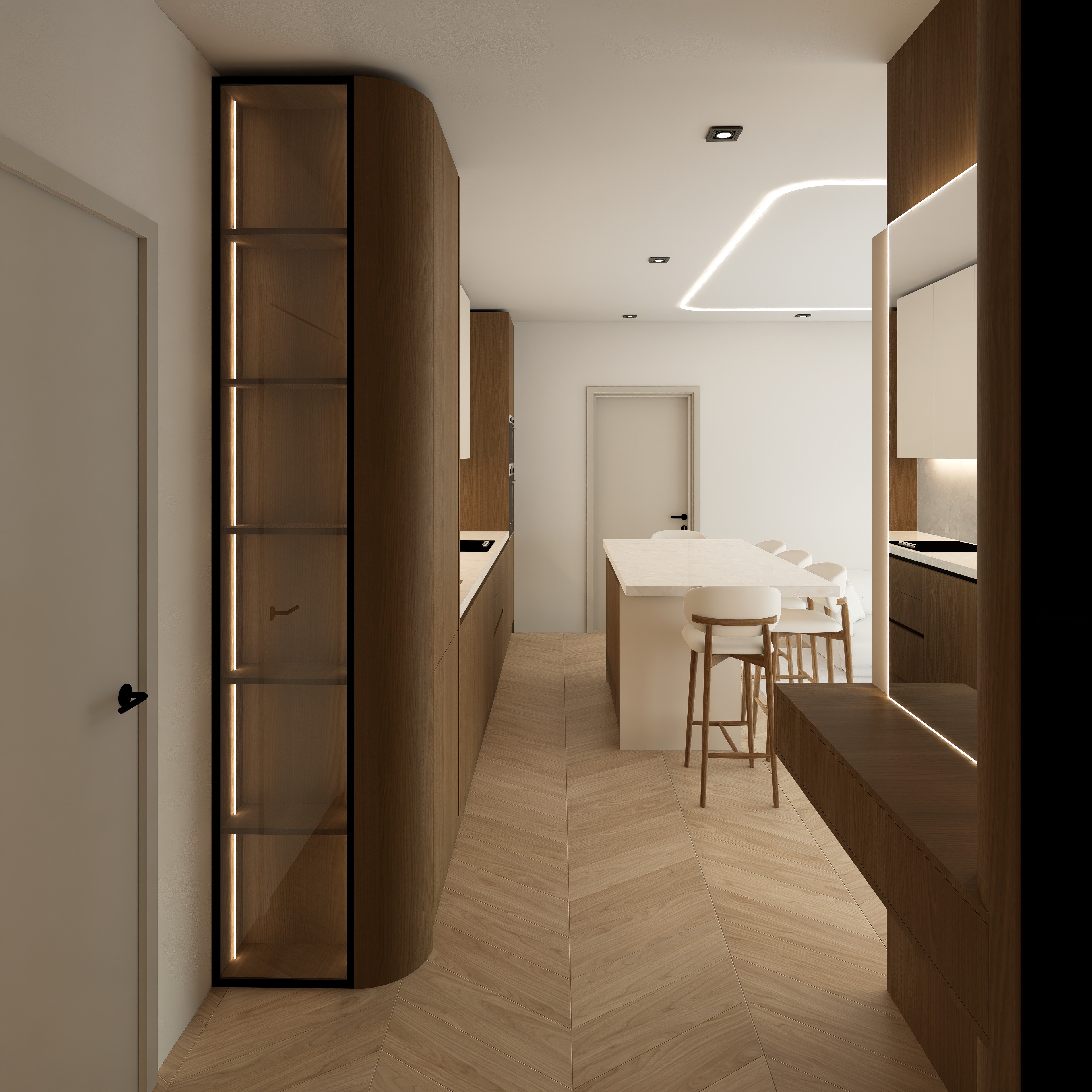 ultra realistic interior render of a modern minimalist corridor connecting to kitchen and entry area do not change the design layout proportions materials or camera angle enhance realism with physically accurate lighting and textures full height cabinetry curved panel dark warm walnut wood veneer rich natural grain subtle tonal variation matte satin finish seamless continuous texture match all previous scenes exactly curved edge smooth soft radius with clean transitions no seams glass display cabinet left clear glass with slight reflection and transparency thin black frame profile interior of glass cabinet walnut veneer backing integrated vertical led strips 3000k warm white soft glow evenly diffused kitchen visible in background upper cabinets matte cream finish island backsplash light beige stone honed matte bar stools light wood cream upholstery keep consistency with previous kitchen render entry console right same walnut veneer integrated led mirror glow visible soft indirect light flooring light oak wood in herringbone pattern matte finish with natural grain variation lighting led strips inside glass cabinet 3000k soft and continuous ceiling recessed spots perimeter led 3000k smooth and minimal subtle light spill from adjacent spaces living kitchen balanced exposure no overblown highlights realism details micro roughness variation on wood veneer slight imperfections in glass reflections not perfectly clean ambient occlusion at joints edges and floor wall connections soft shadows along corridor depth natural light falloff to create depth perspective glass slight reflectivity transparency balance no mirror effect maintain realism overall warm neutral tone consistent across all scenes high end architectural visualization quality cinematic depth but still natural no over sharpening no artificial glow