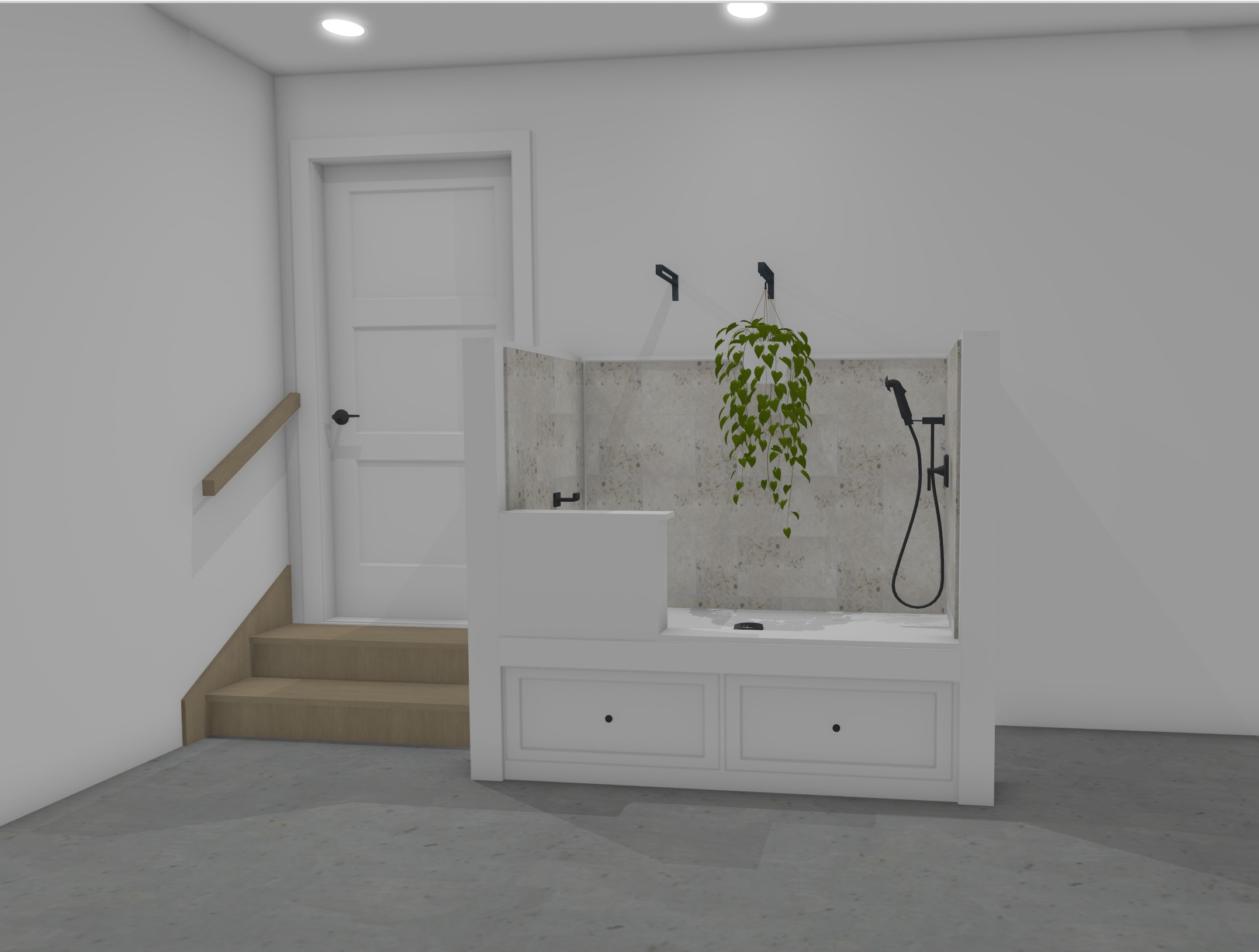 make this image a photograph of a dog shower in a garage the floor of the shower will be a 2x2 mosaic that matches the wall tile inside the shower