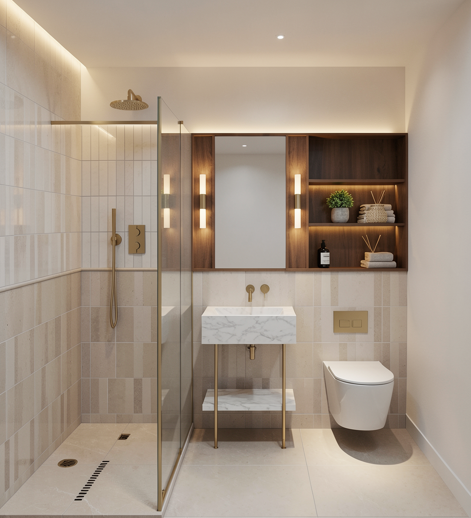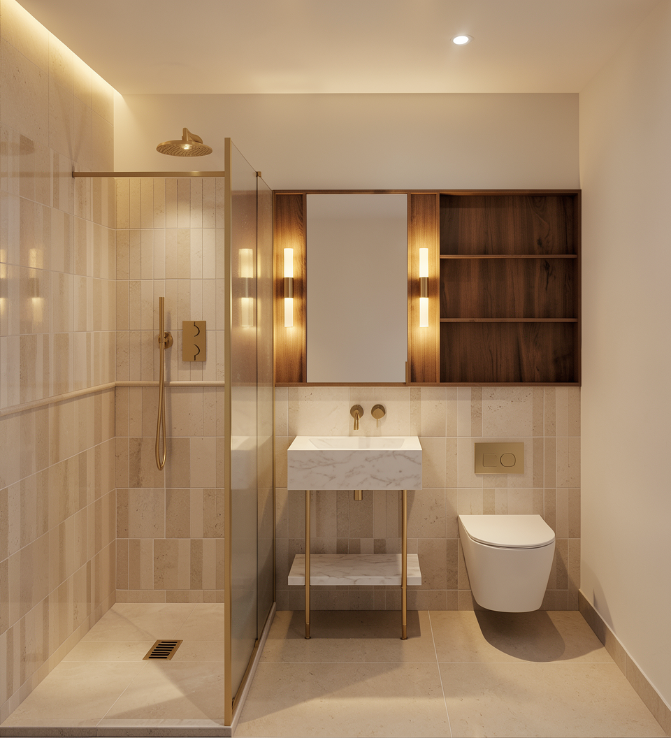 beige interior design subtle led lighting oak wooden flooring horizontaly beige table with oak elements