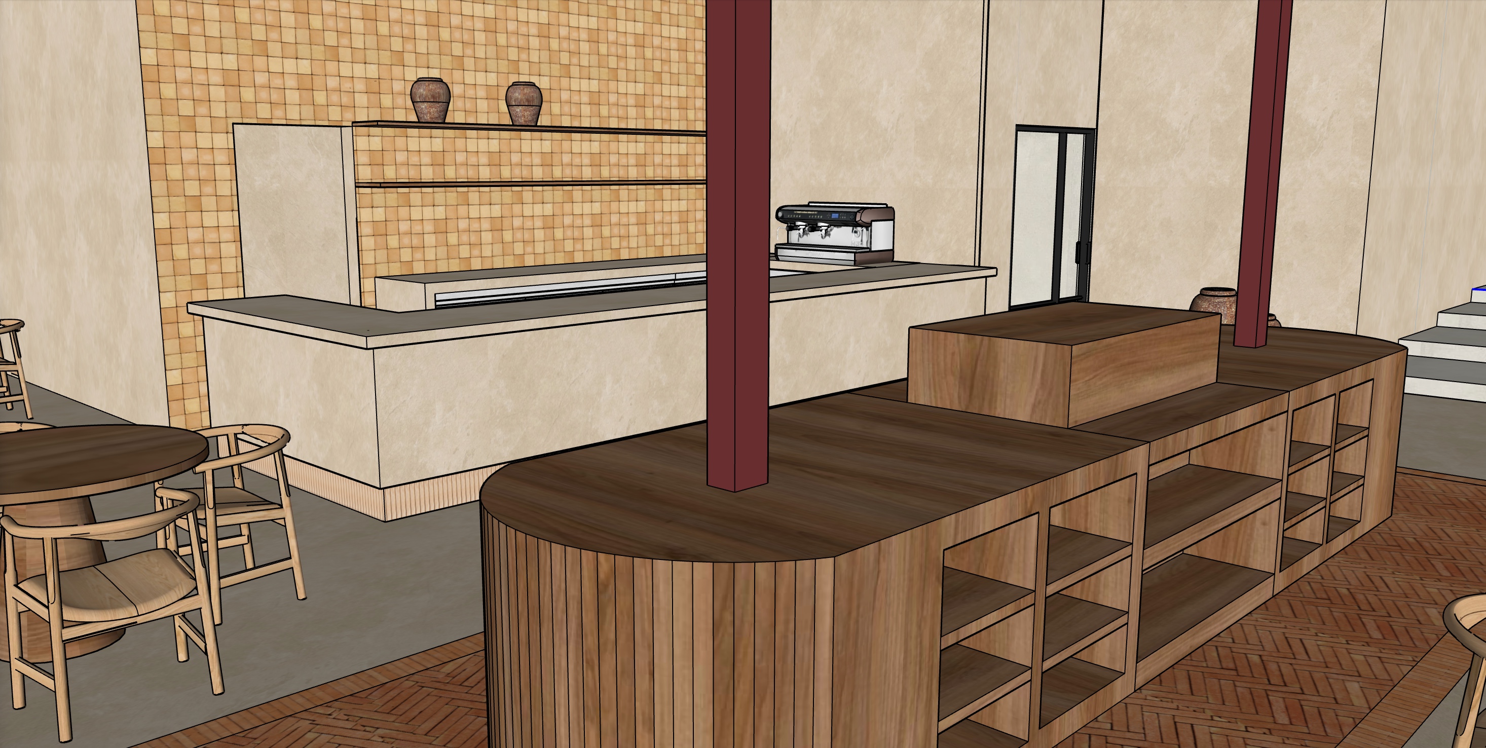 renderiza esta imagen como una imagen real ten en cuenta que la barra de bar esta hecha de microcemento como la textura que te adjunto y que el rodapi s es de azulejos de barro como en la imagen que adjunto la trasera de la pared es de los azulejos de barro que te adjuto la mesa de madera central tiene unos pilares met licos de viga in i en color terracotta haz que la luz del espacio no sea muy fuerte ya que el espacio tiene luz natural pero no mucha