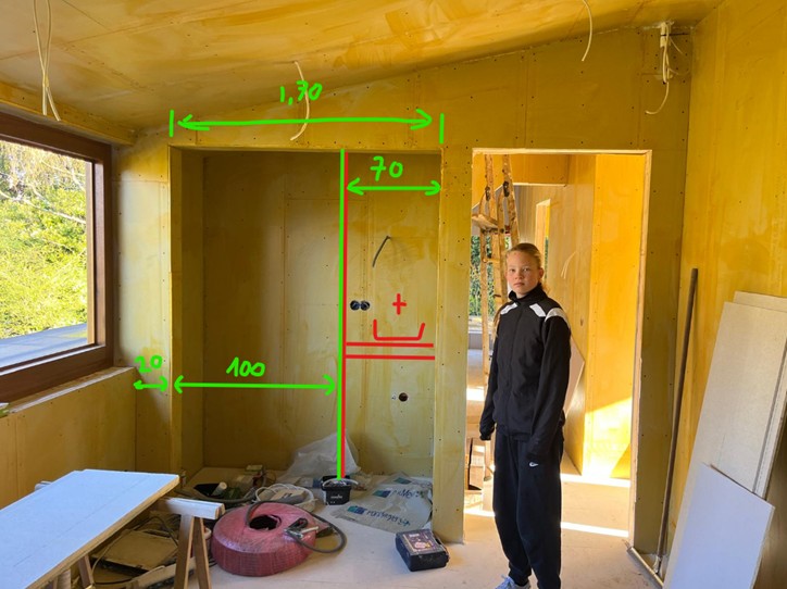 zie deze foto van een ruimte waarin een kastje moet komen in de nis in het nisje waar de rode lijnen staan komt een wastafel links ertegenaan komt dan een strakke kast met twee deurtjes de wanden moeten allemaal een lichte tint greige worden het kastje ook de persoon op de foto mag weg alle verhoudingen 100 aanhouden ook alle rommel moet weg maak er een mooie kamer van de deuropening waar het meisje in staat mag dichtgezet worden met een deur kozijn zorg dat de ruimte helemaal af is het is een kamer van een jonge vrouw