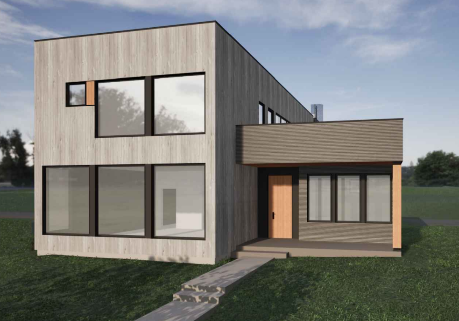 modern exterior shot light grey james hardie siding darker grey siding accents one strip of tan siding to the right light tan door add grass architecture