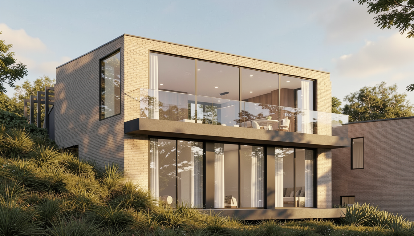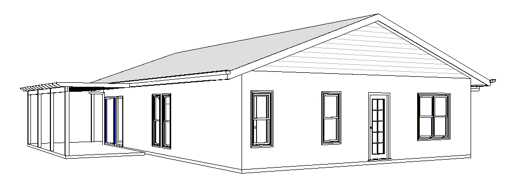zinc corrugated roof shingles to gable rendered walls timber windows lawn trees behind brick path to front door