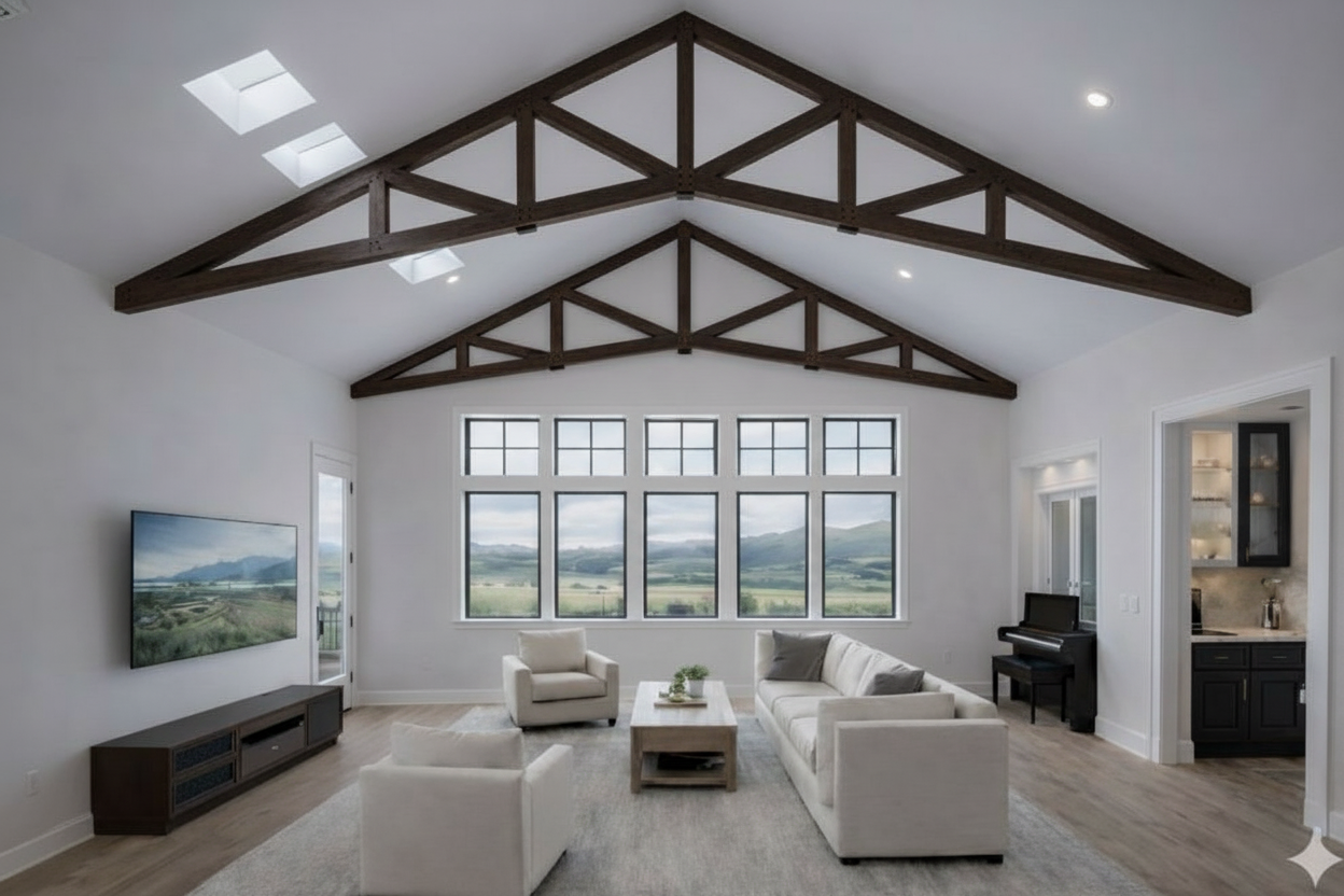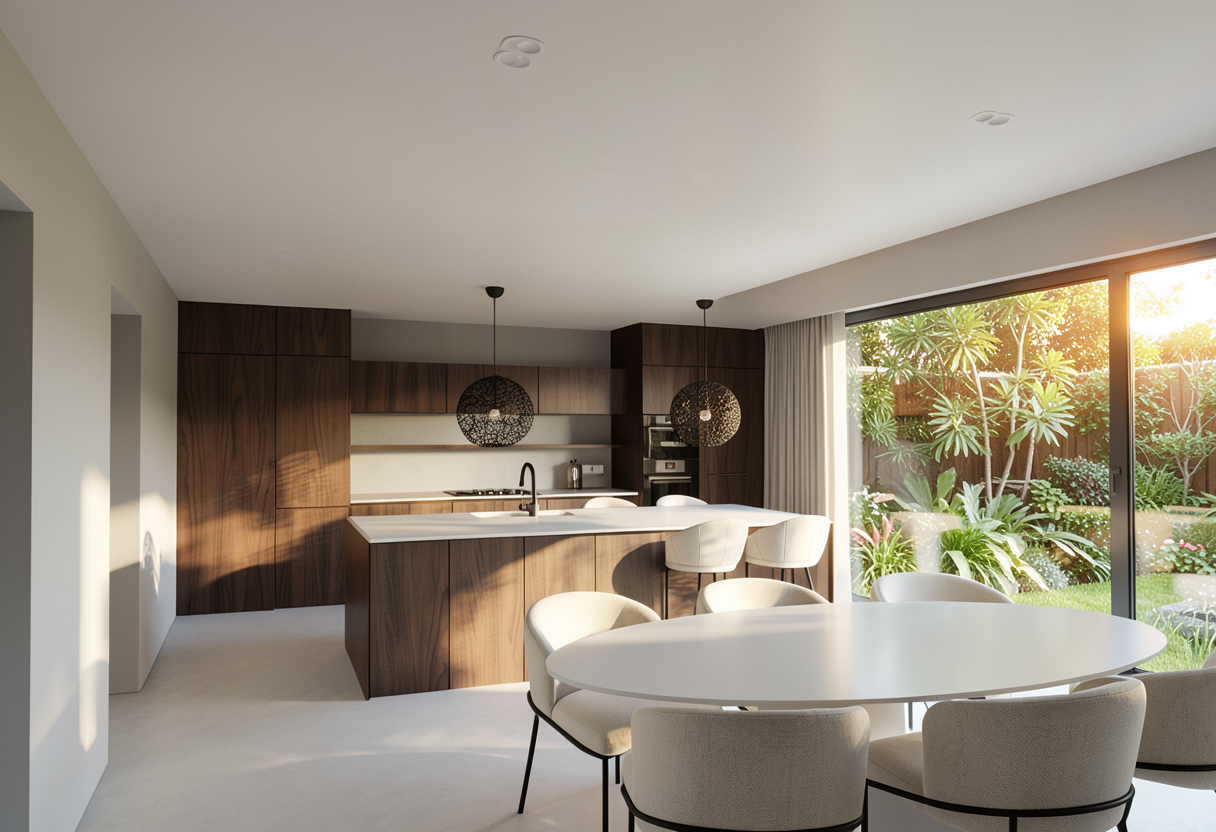 render a modern kitchen interior with a refined and elegant atmosphere use rich dark walnut wood for the cabinets and island the countertops and the backsplash both under and on top of the floating wall units should be a light microcement matt finish the pendant lights hanging above the island are black and intricately designed casting delicate shadows the chairs around the white round dining table are upholstered in a soft off white fabric paired with minimalist black metal legs through the large sliding glass doors display a lush green garden full of vibrant foliage basking in soft afternoon sunlight the walls are smooth and light creme enhancing the clean contemporary japandi feel