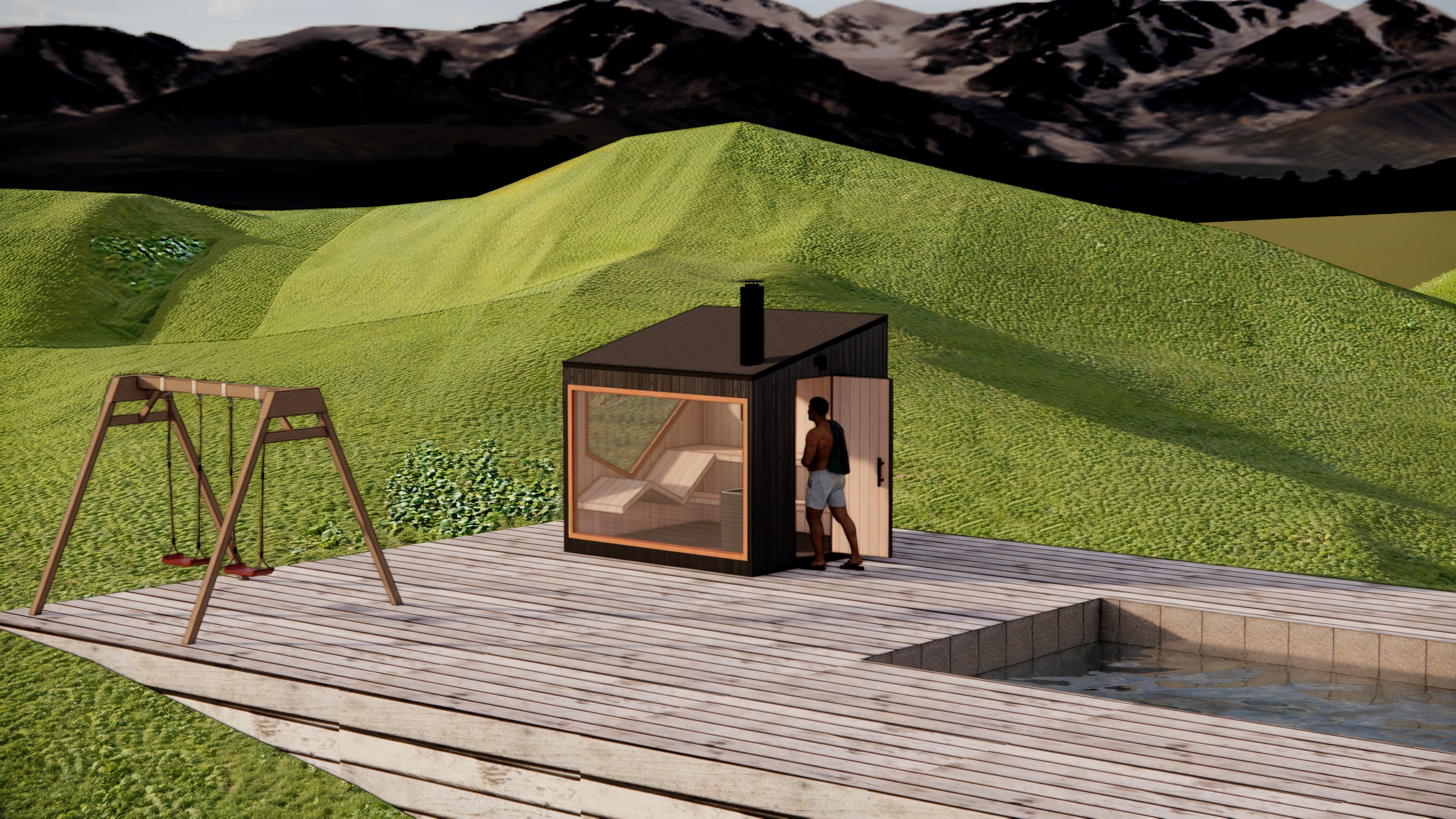render a photorealistic 3d perspective of this sauna the current material style verticle wood natural wood dark burned siding keep model geometry the same windows doors roof walls make a green meadow around looks native to alpine slopes do not change the view only enhance the current materials and make the landscape nicer vegetation detailed textures in the wood siding and glass reflections and a vibrant clear sky with light atmospheric depth render in hyper realistic architectural visualization quality 8k resolution