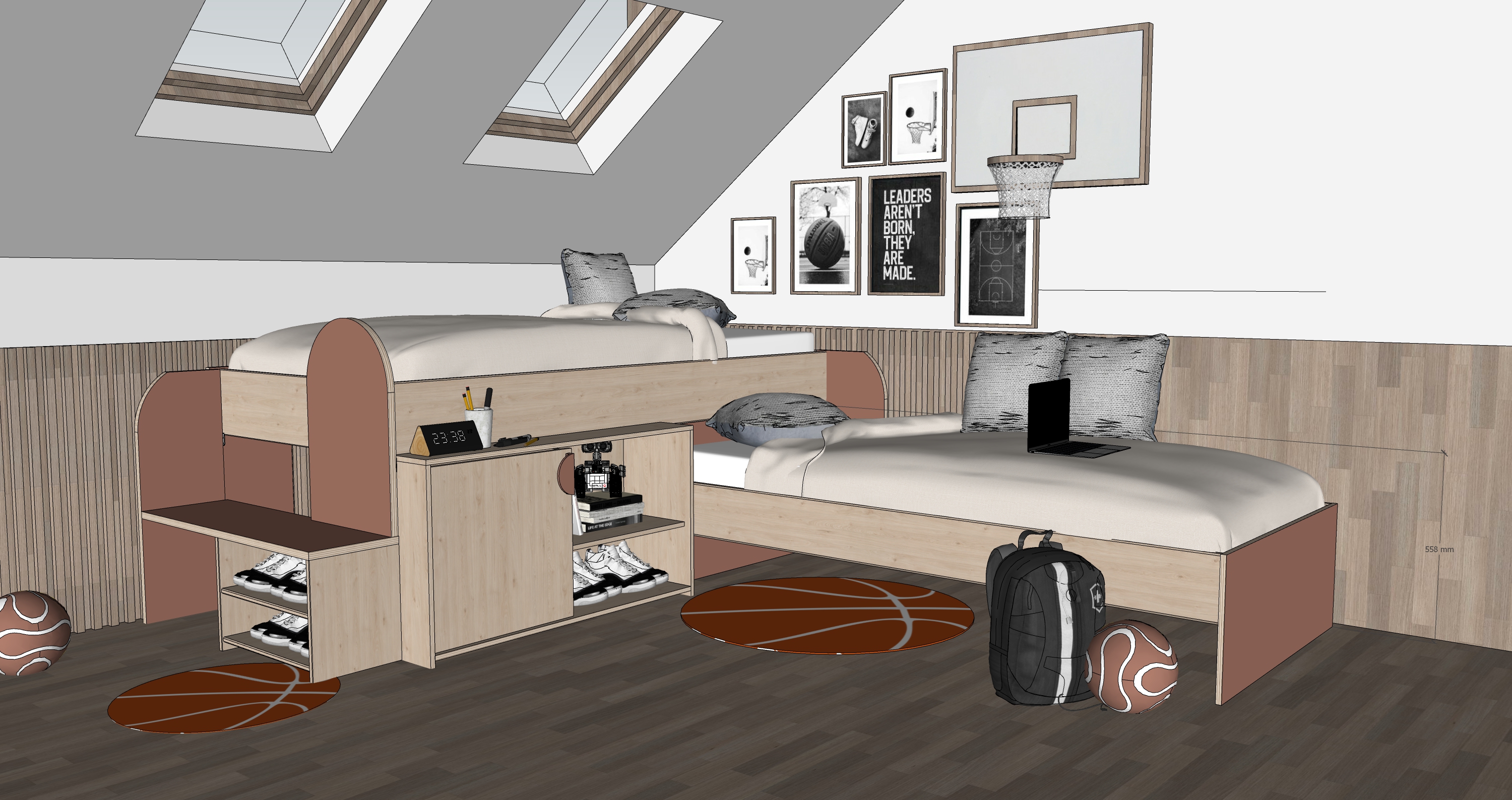chambre enfant avec 2 lit bois clair et terracota satin sur le th me du basquette ball moderne et minimaliste ambiance chaleureuse et naturelle peu de contraste entre ombre et lumi re sol en parquet clair motif chevrons type terrain de basket mur du fond d cor de panneaux verticaux en bois clair la partie haute et plafond sont blanc et le bas des murs sont avec des lattes bois deux velux ouvert au plafond diffuse de la lumi re chaude style scandinave japandi palette de couleurs neutres beige bois clair terracotta literie avec drap et couettes r aliste coussin poss dant une texture laine boucl textur tableau en arri re plans rendre plus r aliste avec des effets de vitre ballon de basket orange et noir photographie ultra r aliste textures tr s d taill es clairage naturel cin matographique ajoute profondeur de champ r aliste quilibre parfait des couleurs qualit 4k ultra hd rendu architectural professionnel